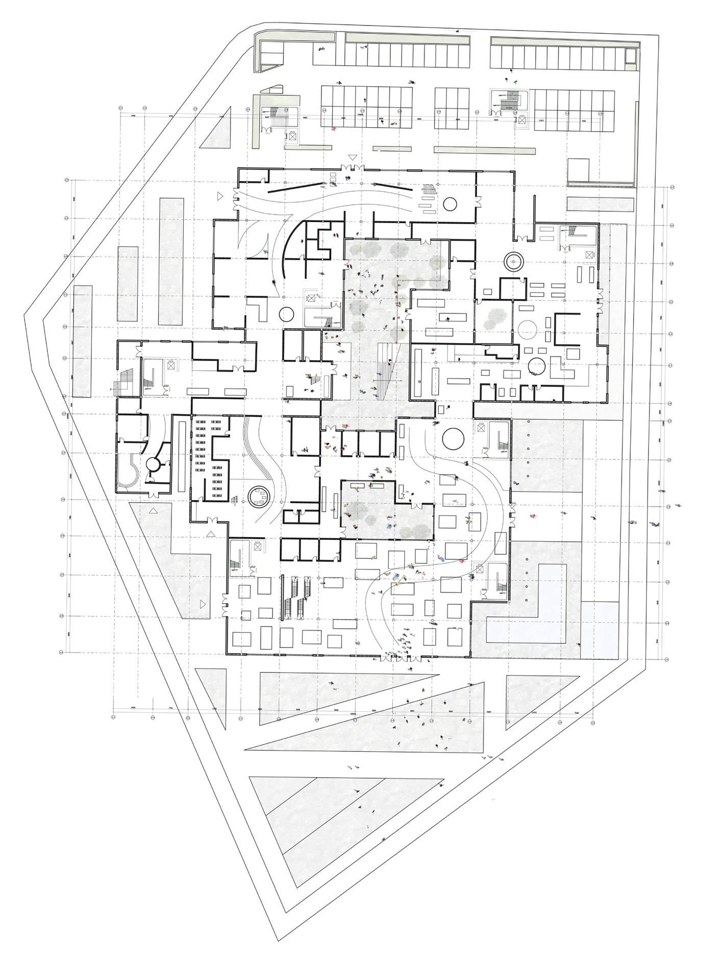 Add a new mass on the left side of the original building structure, and use the original space as a new active space after covering the roof.