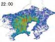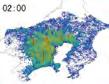 The image illustrates a 3D time-series representation with a height axis that indicated the number of people aggregated according to a 1-km2 mesh. This shows a drastic change between daytime and night time (for example, between 8:00 to 9:00, 18:00 to 20:00), especially in central Tokyo (such as the Ginza area).