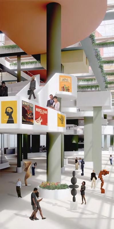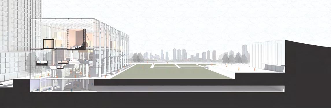 The project, The Neutral Zone, connects the original UNHQ to the northern part of the site to a new armature for inter-agency discussions and collaboration. The ground level is open to public visitors, per the original master plan. There is a visual connection between general visitors and UN staff as people look up to the zigzag grid of the second-level. The second level links multiple nodes of conversation platforms that facilitate cross-departmental conversations, also accommodating overseas UN agencies’ offices. The third and highest level is organized as a square grid of paths connecting various chambers and a common hall, hinted at when people look up from the ground level. The Neutral Zone aims to improve the foundation of the original UNHQ and encourage crossdepartmental dialogue. In this project, we accept the chaos of the world, and forge neutral relationships between different countries’ delegates, the UN, and the general public.