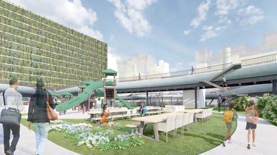 The system could work at a larger scale in the city as a new type of infrastructural system. Trash in surrounding buildings can be collected and transported through horizontal trash chutes to the central building and converted into biochar products. Those chutes are also designed to be skywalks that connect rooftop spaces in the community to create more public spaces in such a high-density area. In this way, the new Infrastructural System serves both functionally and aesthetically, and expands the concept of metabolism to a larger community scale.