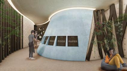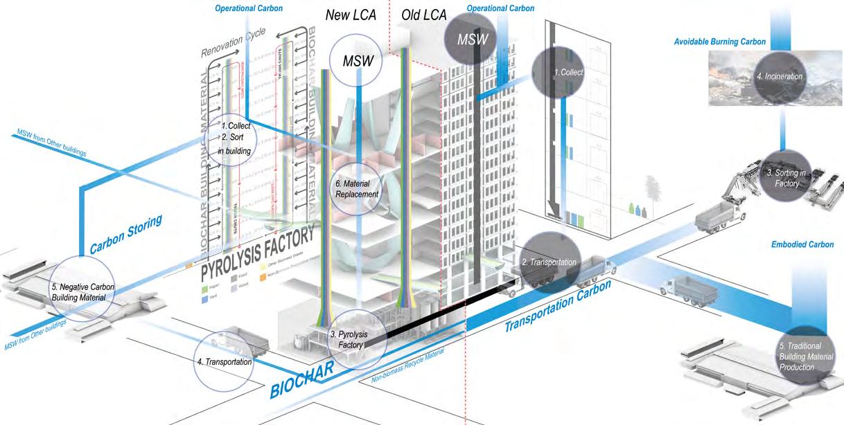 Municipal Solid Waste can be converted into biochar, the negative carbon additives, and its unique advantage include avoiding carbon emissions from waste transportation and burning while permanently storing carbon inside. Combining it with different building materials can lead to the possibility of a self-repairing building that redefines metabolism . The project will design a new trash chute system that collects and converts wastes during the operation of buildings into biochar-included materials as products, which forms a closed loop circulation economy around MSW that encourages a new lifestyle about trash sorted and shared living. MSW collected from surrounding buildings will be re-exported as biochar products to make a bigger influence. This infrastructural system works both at building-scale and urban-scale, connecting buildings, forming public skywalks, and leading to new types of aesthetic spatial qualities around the trash chute system