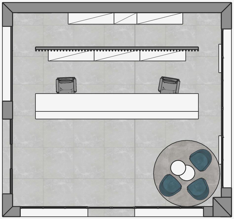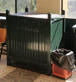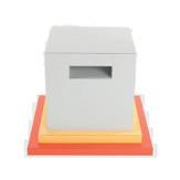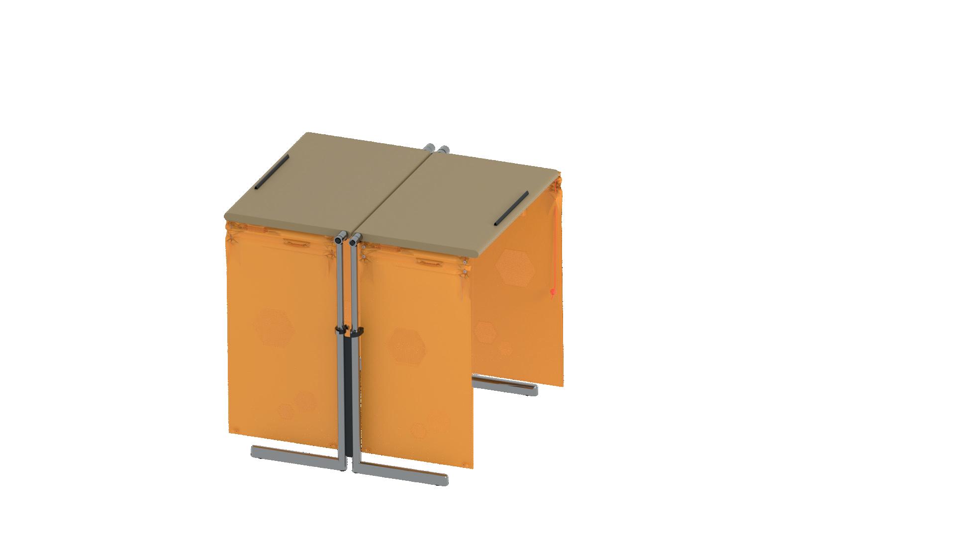 L’inclinazione dei piani e l’utilizzo dei tessuti permette la creazione di una casetta-rifugio ideale per il momento del gioco. Una volta terminato l’uso, i tessuti possono diventare dei sacchetti contenitori. Inoltre, se rigirato il piano diventa una lavagna. Al tavolo si trovano avvitate le parti “femmina” dei bottoni a pressione, mentre al tessuto le parti “maschio” all’interno e alla base, per permettere la chiusura con un’ulteriore “femmina” nella parte superiore.