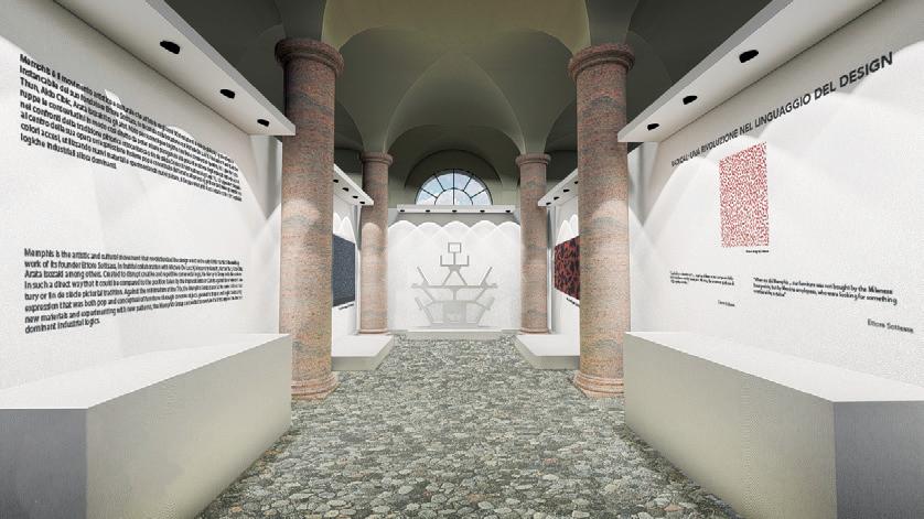 I Mondi di Ettore Sottsass è un percorso espositivo che ricorda la visione progettuale del grande Architetto e Designer che creò gli anni 80. Il visitatore entra in contatto con l’autore attraverso i prodotti, le descrizioni e le citazioni presenti nella mostra. Gli ambienti sono divisi da portali che ricordano la forma del famoso specchio Ultrafragola. Ogni stanza rievoca in maniera cronologica e tematica le differenti esperienze vissute dal protagonista. Il cuore della mostra è la Sala Memhis, la quale, situata al centro dialoga in modo formale con le colonne presenti nella location. Tutta la mostra è facilmente montabile e riutilizzabile per altre esposizioni. I materiali utilizzati sono ecosostenibili e riciclabili.
