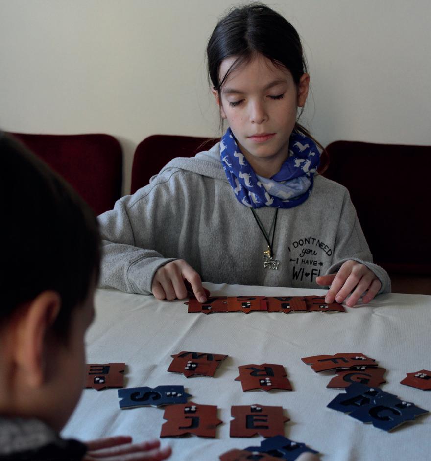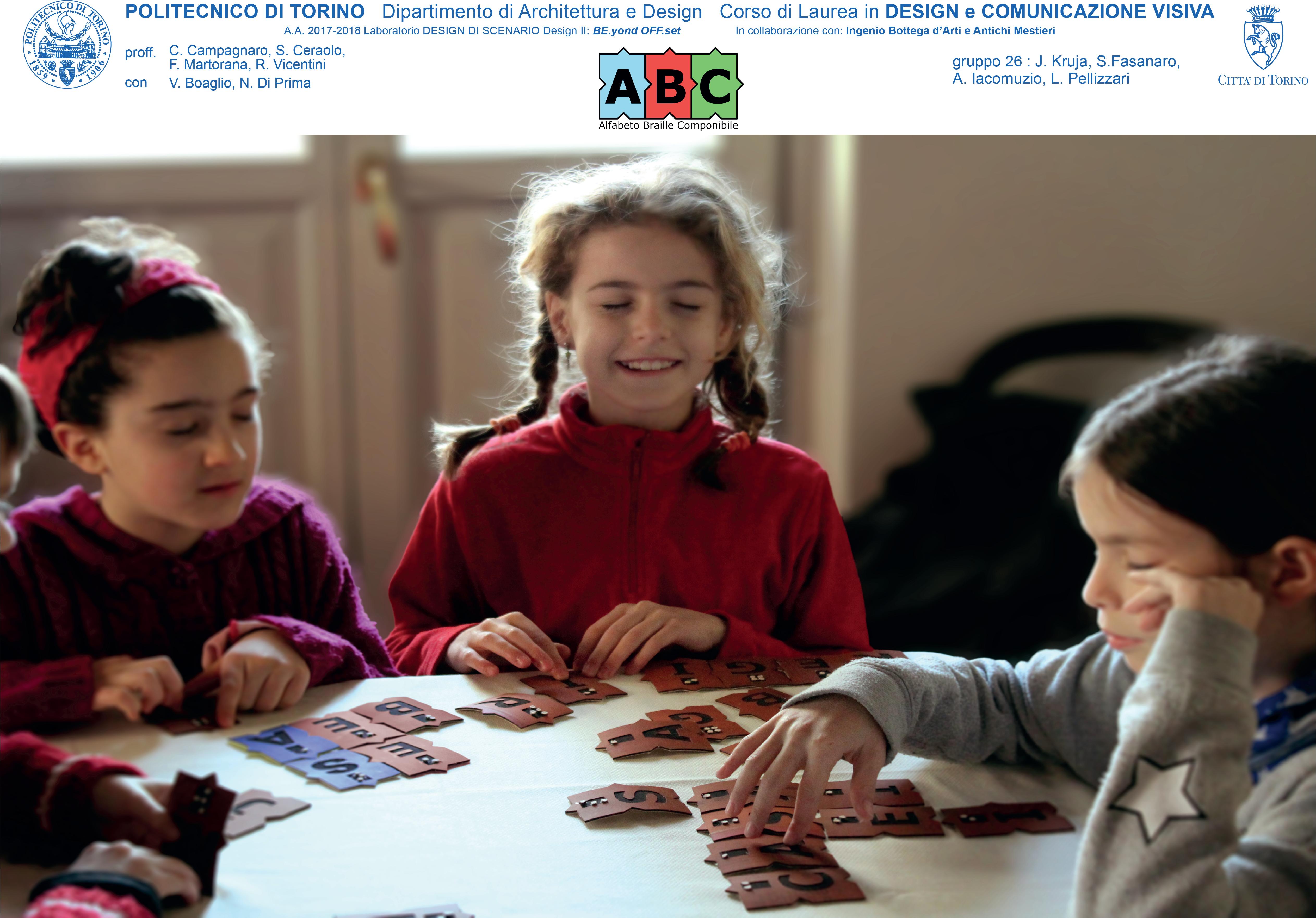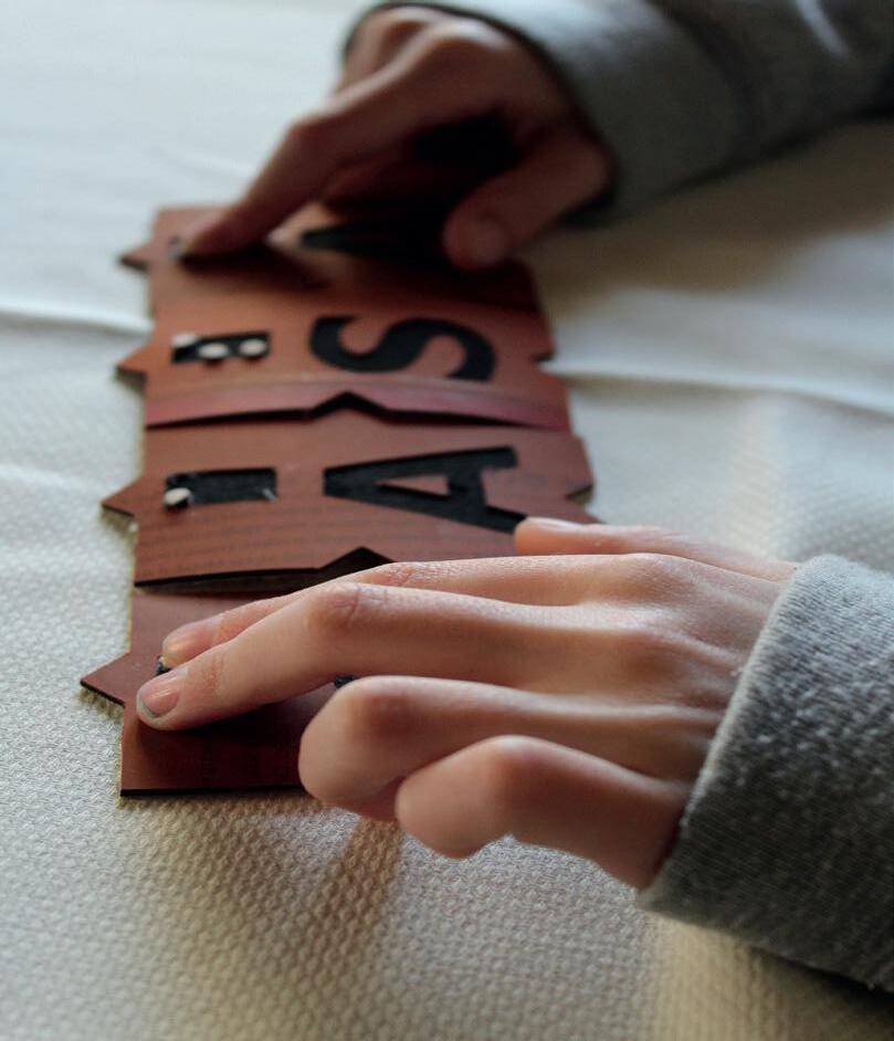 Il progetto nasce per dare una seconda vita a lastre di caucciù utilizzate nelle stampanti ad offset. Le tessere realizzate tramite lavorazioni artigianali hanno l’obbiettivo di creare un ausilio versatile ludico alla didattica destinato alle persone affette da disabilità visive. Attraverso un processo di upcycling sfruttando il contrasto dei tre strati del materiale si ottiene una multicanalità sensoriale per il bambino al fine di imparare in modo ludico l’alfabeto braille e latino.