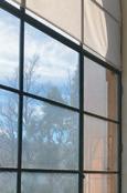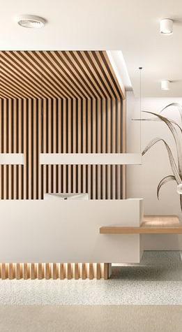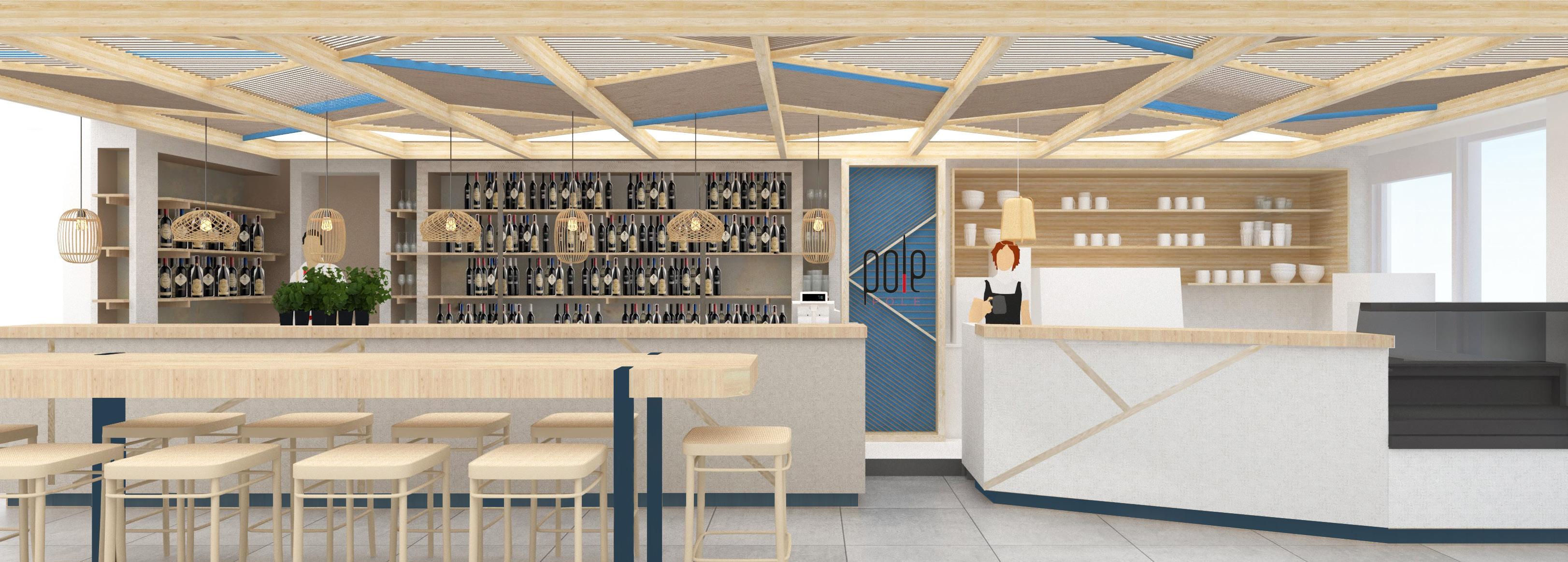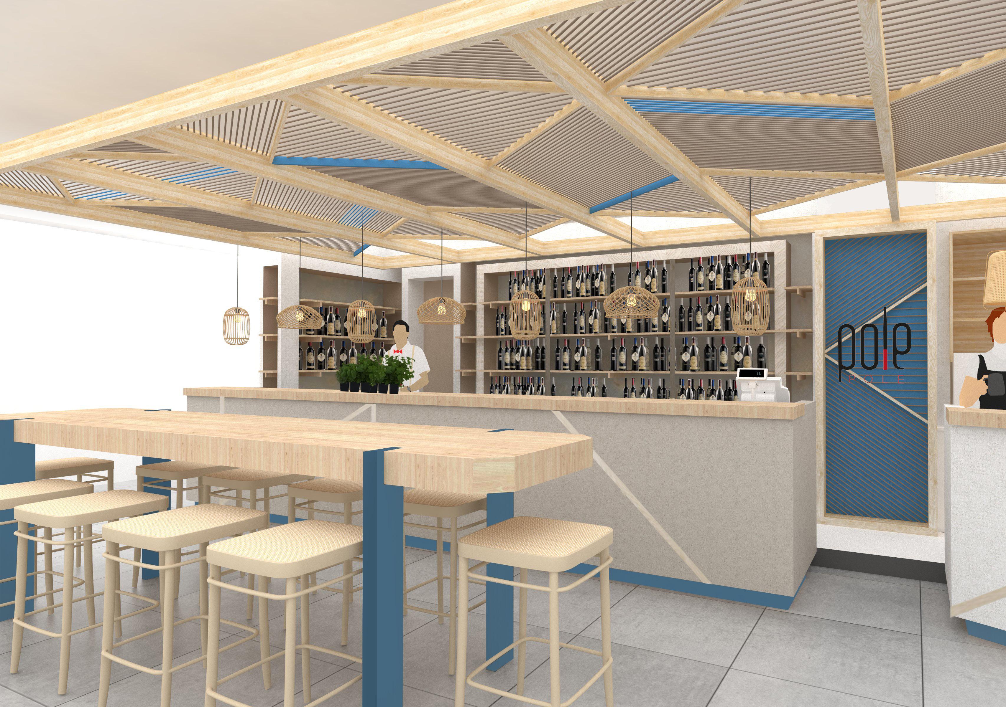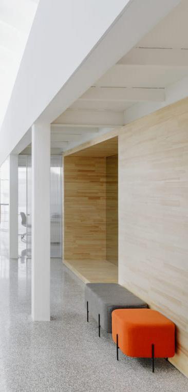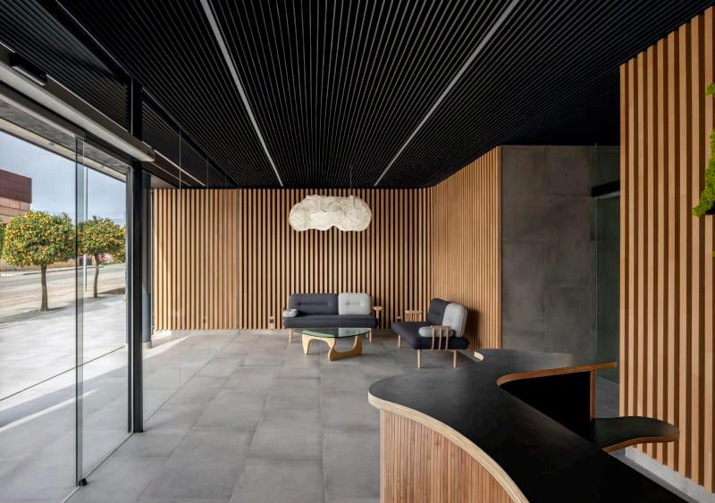le pareti vetrate favoriscono l’ingresso della luce, listelli contribuiscono a creare un’ambiente più riservato