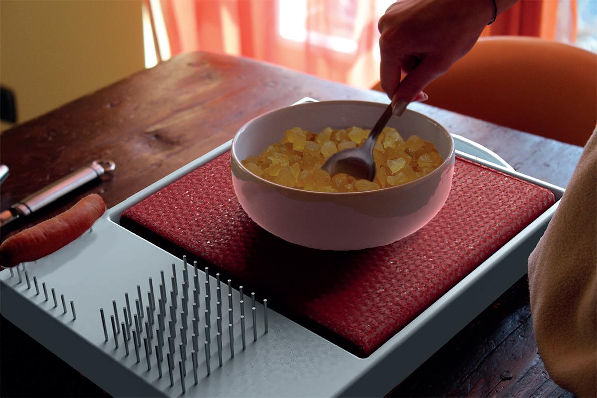 Il tagliere è stato progettato per consentire a tutti di completa autonomia anche chi ha amputazioni a un arto superiore, soggetti con nelle mani o per utenti emìplegicì. Il prodotto si divide in due parti: la prima parte formata dalla presenza di gruppi di chiodini sporgenti con diverse lunghezze permettendo di tagliare e pelare senza che il cibo si muova; la seconda da un contenente un gel di ultima generazione alla forma di qualsiasi alimento bloccandolo, dando la possibilità di eseguire diversi lavori come: mescolare, tagliare, squamare, ecc. la semplicità delle linee che compongono il prodotto e i colori danno la possibilità di integrarlo in diverse tipologie di cucine dallo stile moderno a quello classico.