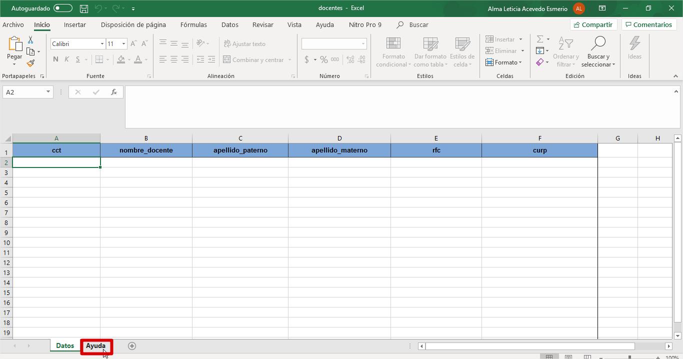 Con la finalidad de llenar correctamente las plantillas de trabajo, dar clic en la pestaña AYUDA.