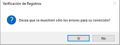 Posteriormente, se muestra la leyenda: “¿Desea que se muestren sólo los errores para su corrección? “ dar clic en SI para mostrar los errores identificados.