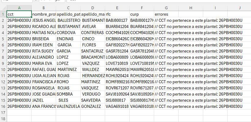1. Al dar clic en EXPORTAR ERRORES se descargará un nuevo archivo Excel, con los registros erróneos.