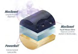 A rapid-release powder is applied to the bait...derived from the same fish-attracting formula as...MaxScent...activates instantly when the bait hits the water, creating a scent-producing slime that begins dispersing scent immediately.
