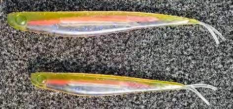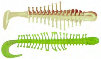Berkley soft-bait engineer Kyle Peterson said that when the Minnow rolls over on its side, that causes the tail to wiggle. He aso said the air pocket/buoyancy chamber causes less “hook wear” to the bait, and that these are not 1-fish baits.
