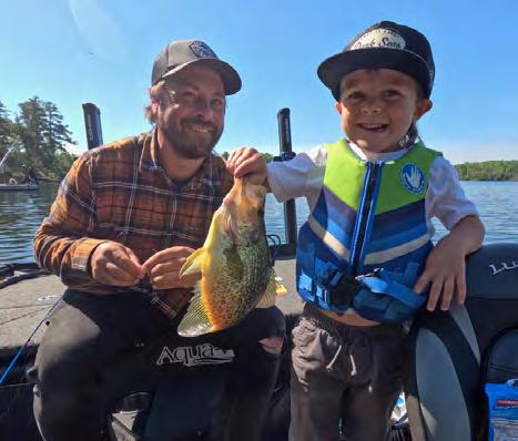 Bluegills are impressive little fighters, and they still grow big in the North Country. Don’t be surprised if you hook a plate-sized bluegill, pumpkinseed or hybrid sunfish. All are members of the sunfish family. Bluegills are slightly yellow with hints of purple, and males have a red breast. Pumpkinseeds are very colourful, displaying shades of orange, green and yellow. Hybrids are slightly tiger-striped and mostly reddish in color. Pumpkinseeds and hybrids rarely exceed a pound. Bluegills can reach a pound and a half, and they may even push two pounds on rare occasions.