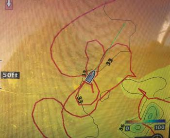 In skinny water, I tilt my outboard motor up high enough to keep the prop from catching wild rice or floating vegetation. I cruise slowly with my Minn Kota down and Side Imaging set at 70100 feet looking for circular shadows on my Humminbird Xplore. When anchoured, you will still see shallows on your scrolling screen.