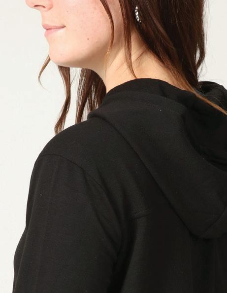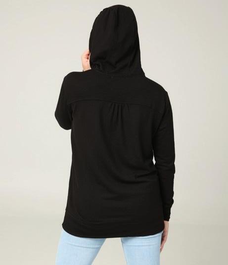 Funnel neck crossover hoodie long sleeve with thumbholes, Princess seam detail, Center back gathered yoke detail. Soft hand medium weight knit with a brushed back fleece fabric. Ladies Fit, Semi-Fitted. Soft hand, medium weight.