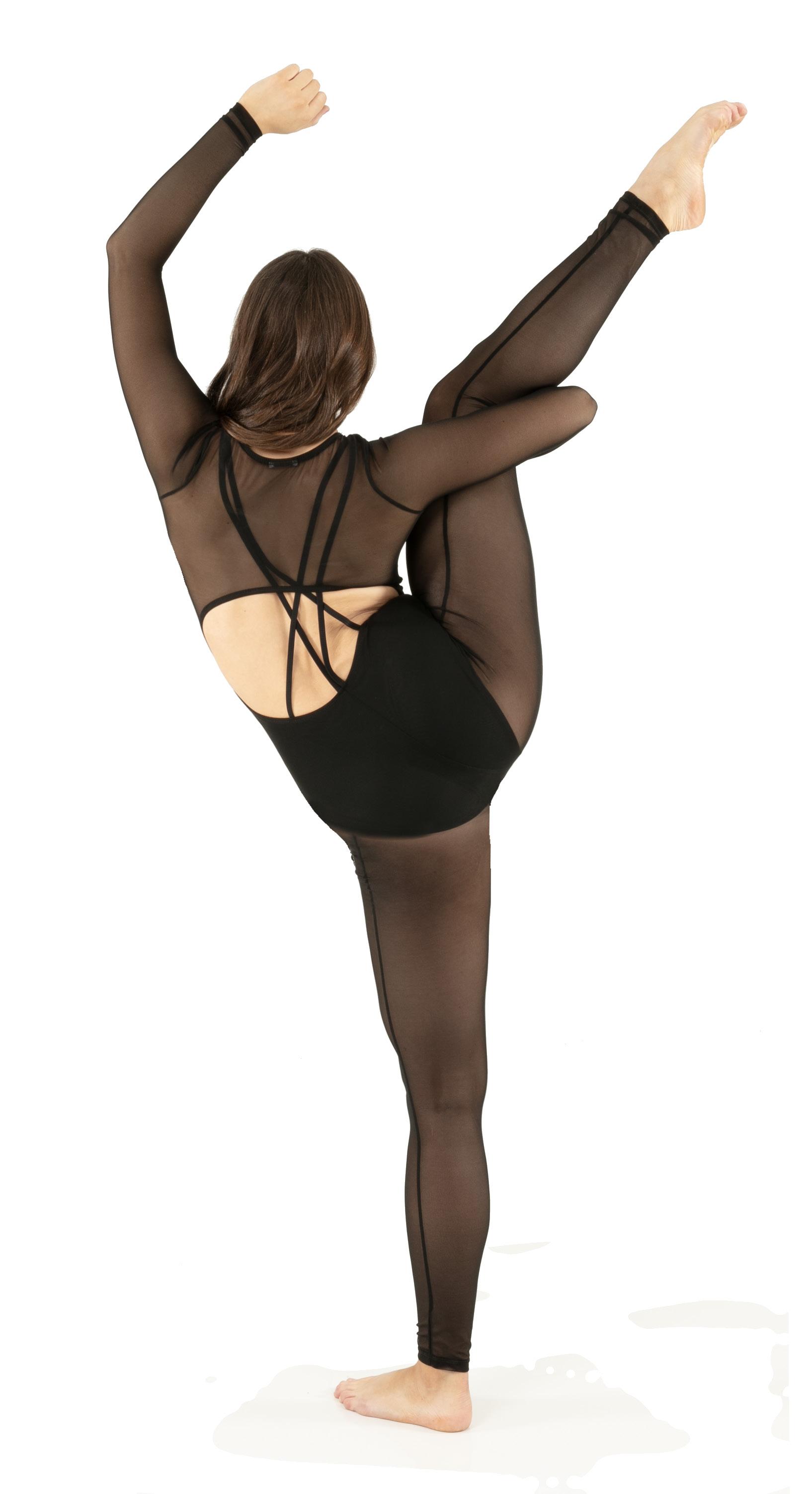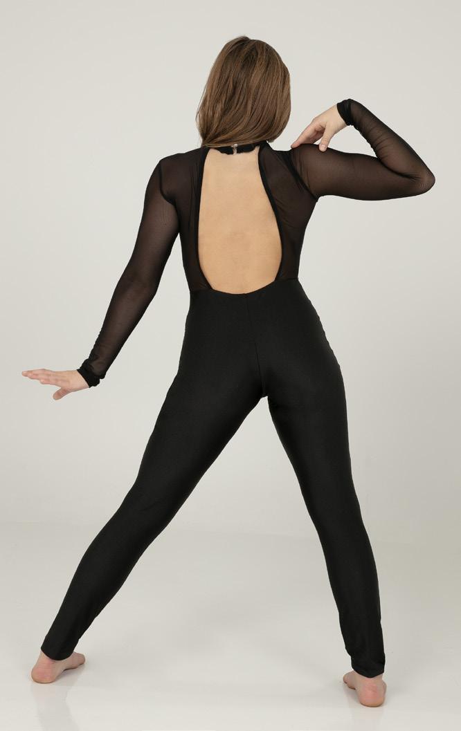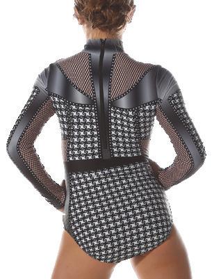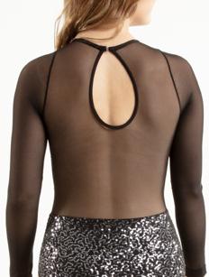 Alexandra. Sequin leotard with mocked raglan cut mesh sleeves with wider shoulder seams and an upper sequin back panel. Peek-a-boo lower mesh back panel. Front and back lined with binding along the neckline and leg opening. Center back zipper closure. Polyester, Nylon.