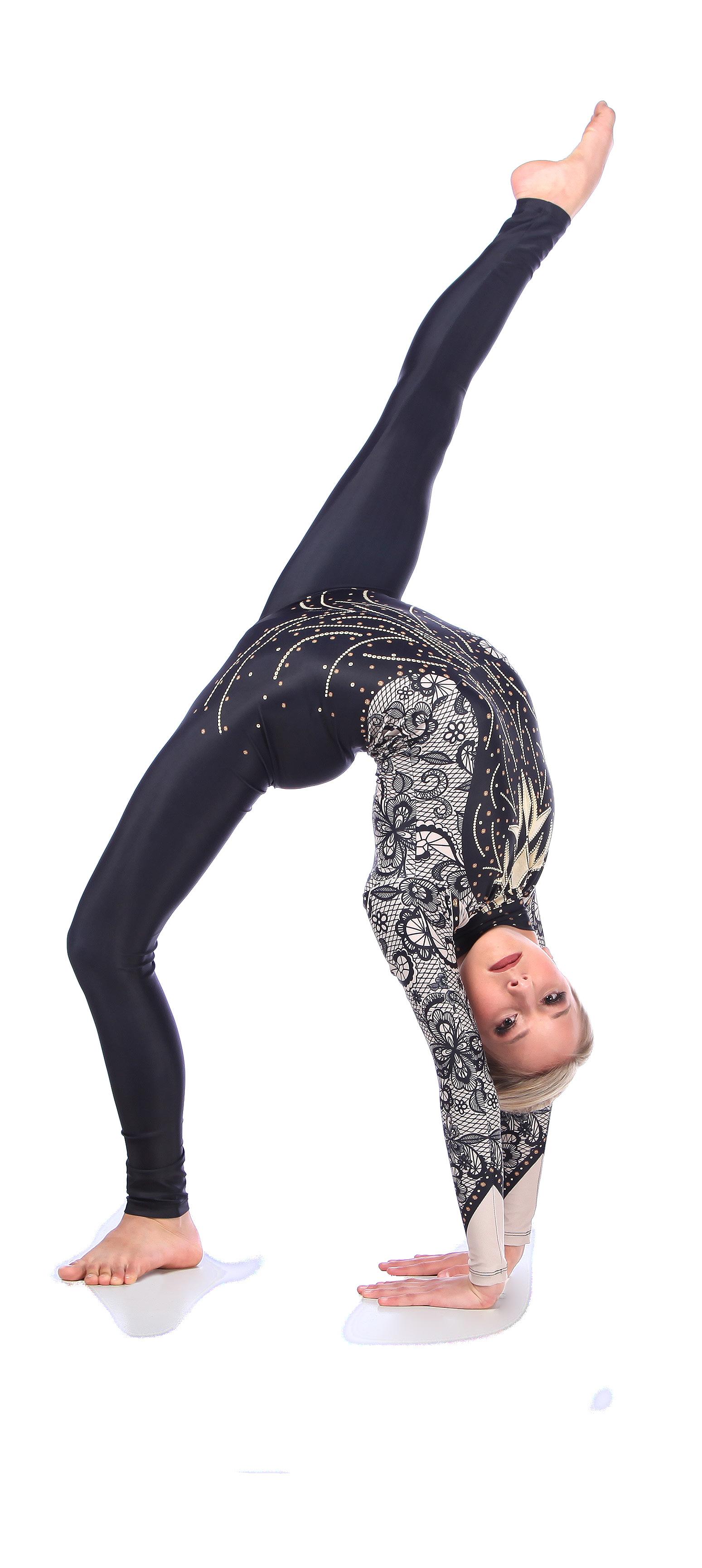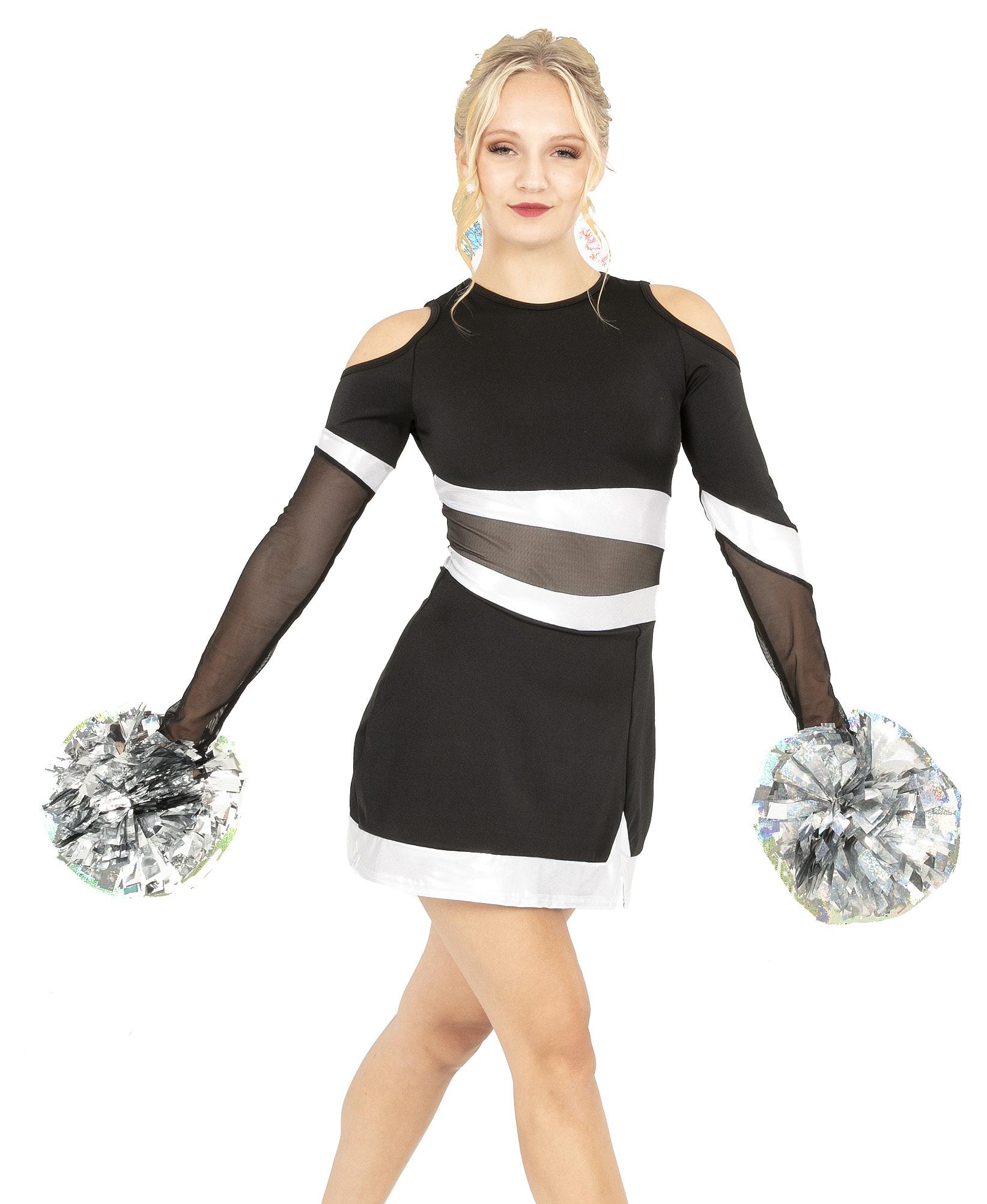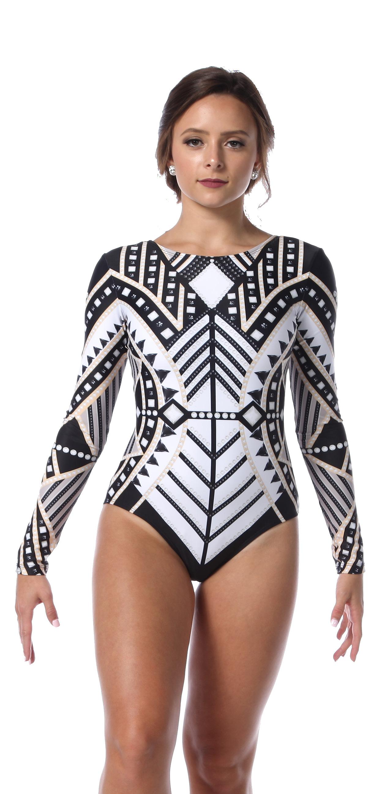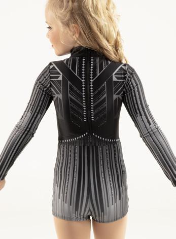 Alexandra. Black tricot-based leotard includes white foil panels along the upper body, down the sleeves, and midriff area. The extra detail of the added rhinestones makes this a perfect POM or Hip-hop performance piece. Comes with rhinestones already attached.