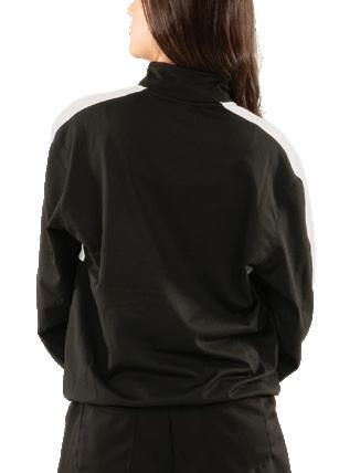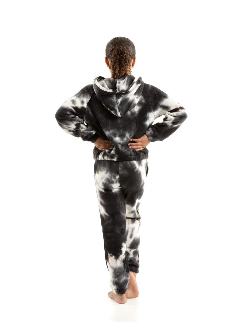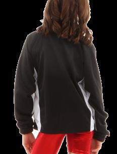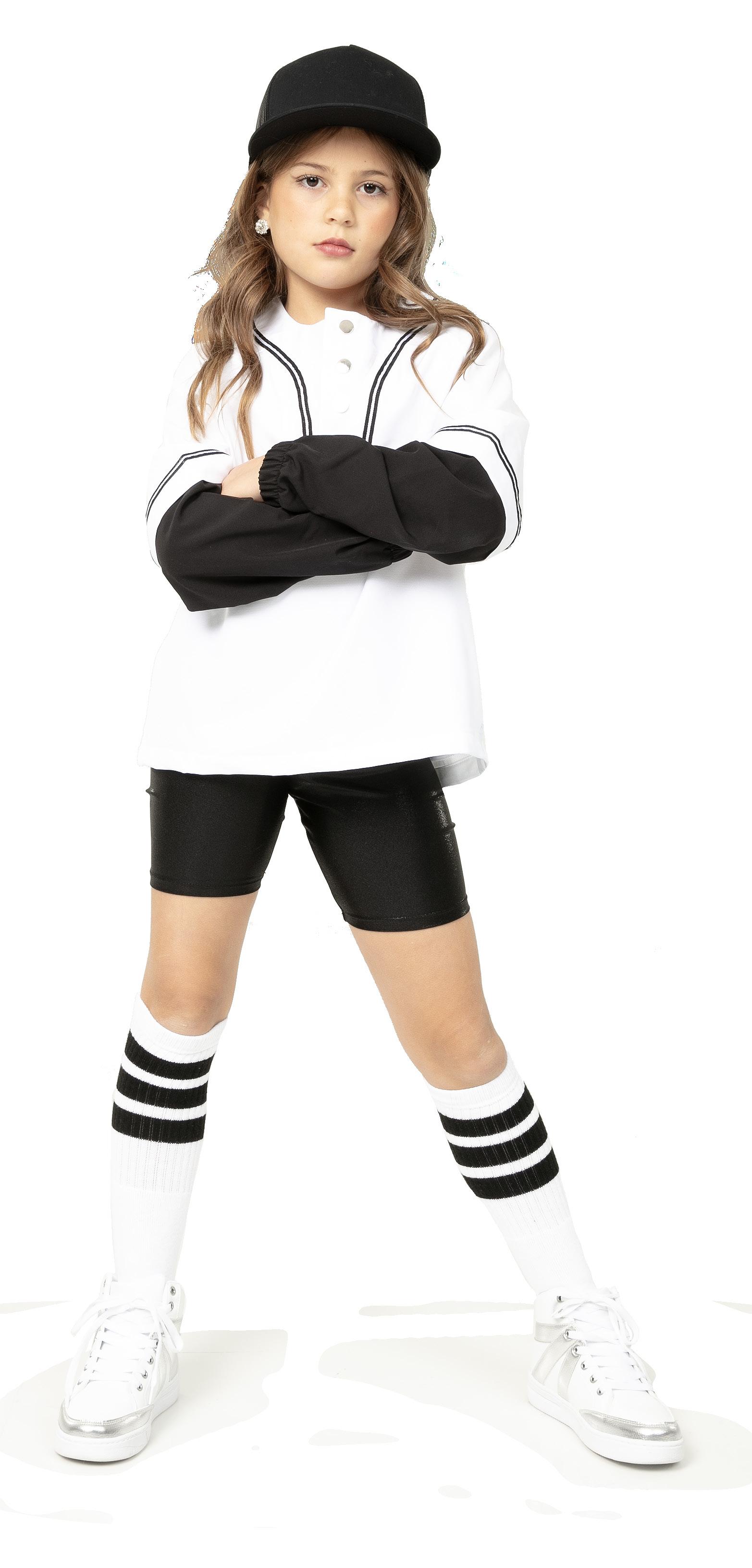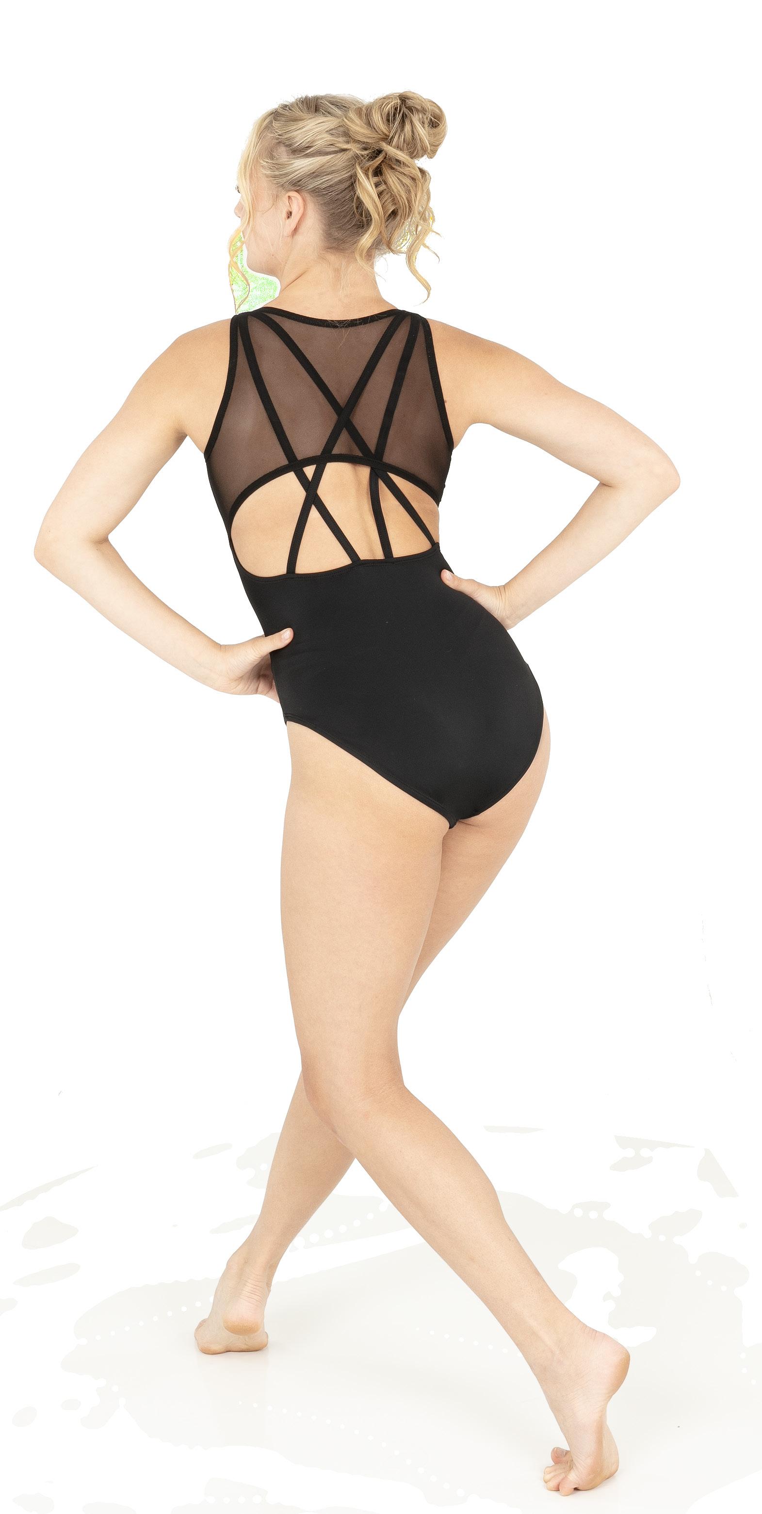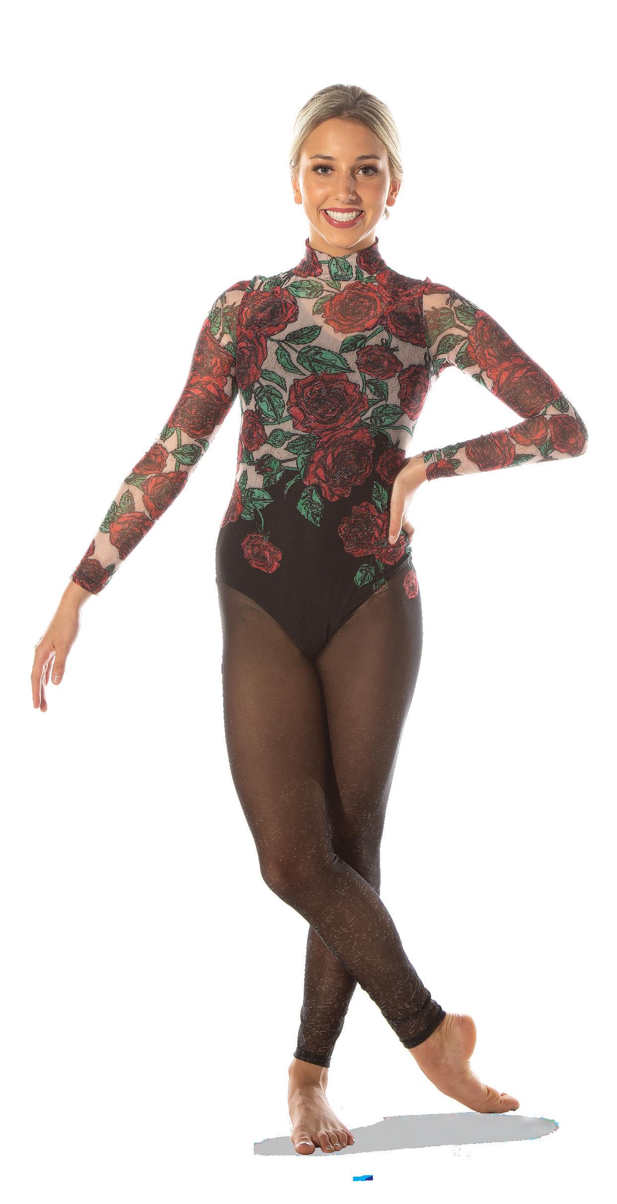 Alexandra. Black tricot-based leotard includes white foil panels along the upper body, down the sleeves, and midriff area. The extra detail of the added rhinestones makes this a perfect POM or Hip-hop performance piece. Comes with rhinestones already attached.
