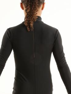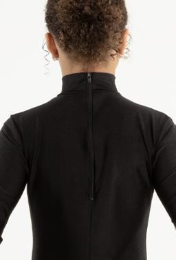 Alexandra. Long sleeve mock neck crop top is fully lined.. Center back zipper closure. Black Tricot, Nylon, Spandex.