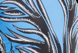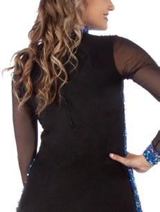 Alexandra. Long sleeve sequin tunic top front consists of multi-blue hue sequins, black tricot back, black power mesh sleeves, with sequin cuffs. Fully lined on the front bodice, neckband, cuffs for comfort. Center back zipper. Nylon, Spandex.