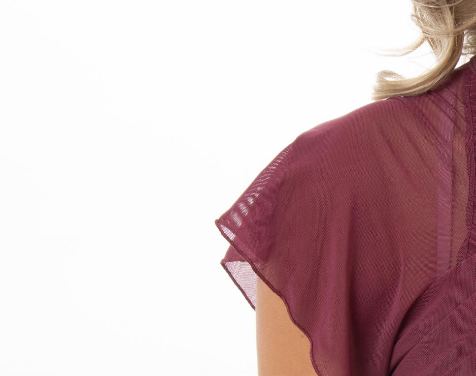 Alexandra. This performance sequin top features mocked raglan cut mesh sleeves with wider shoulder seams for undergarment coverage. The foiled sheen mesh and accented sequin panel cuffs on the sleeve add just the right amount of glamour. The back includes a matching color foil stretch fabric. Front lined, binding along the neckline for comfort. Polyester, Nylon.