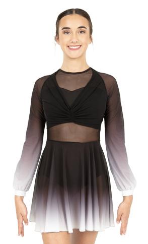 Alexandra. Asymmetrical dress with long sleeves consists of a cutout shoulder panel, asymmetrical silver foil, and black mesh panels. A tank shoulder and circle neckline bodice consists of asymmetrical silver foil and black mesh midriff panels. The midriff panel is lined. Attached skort