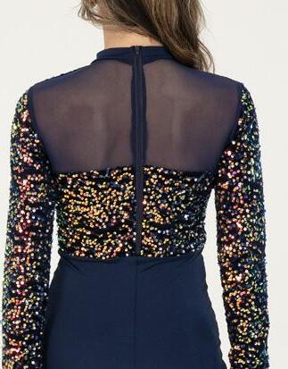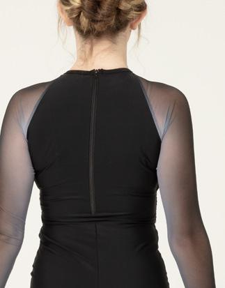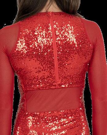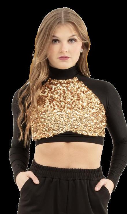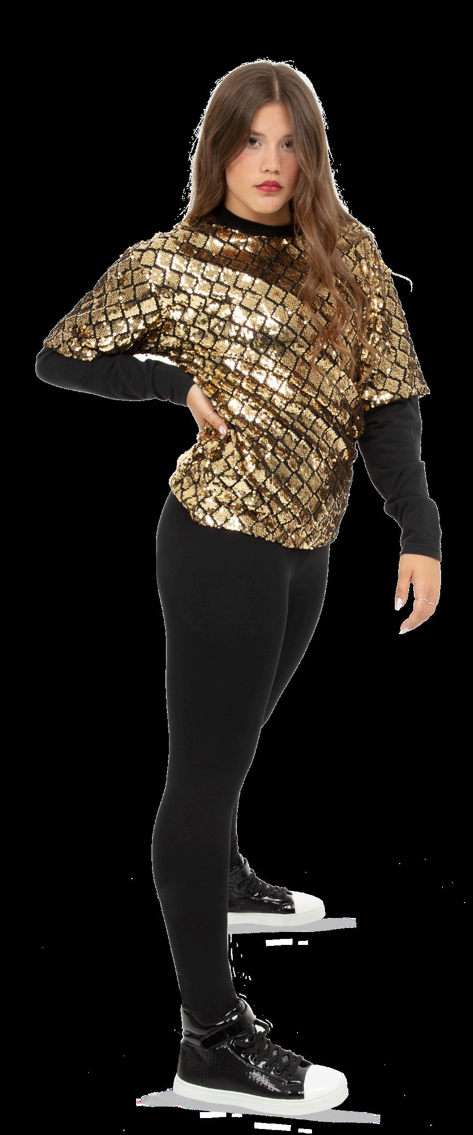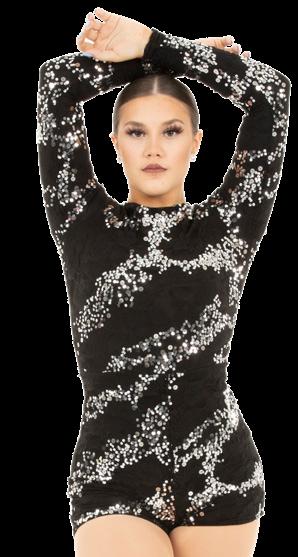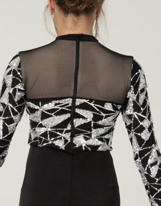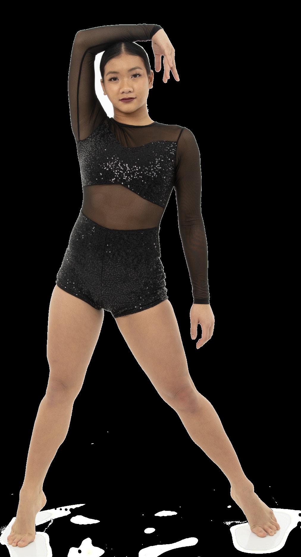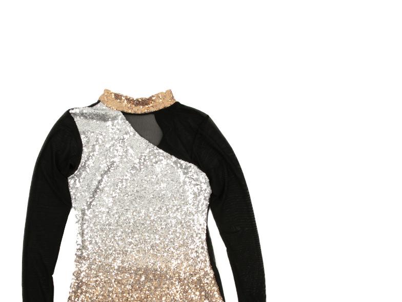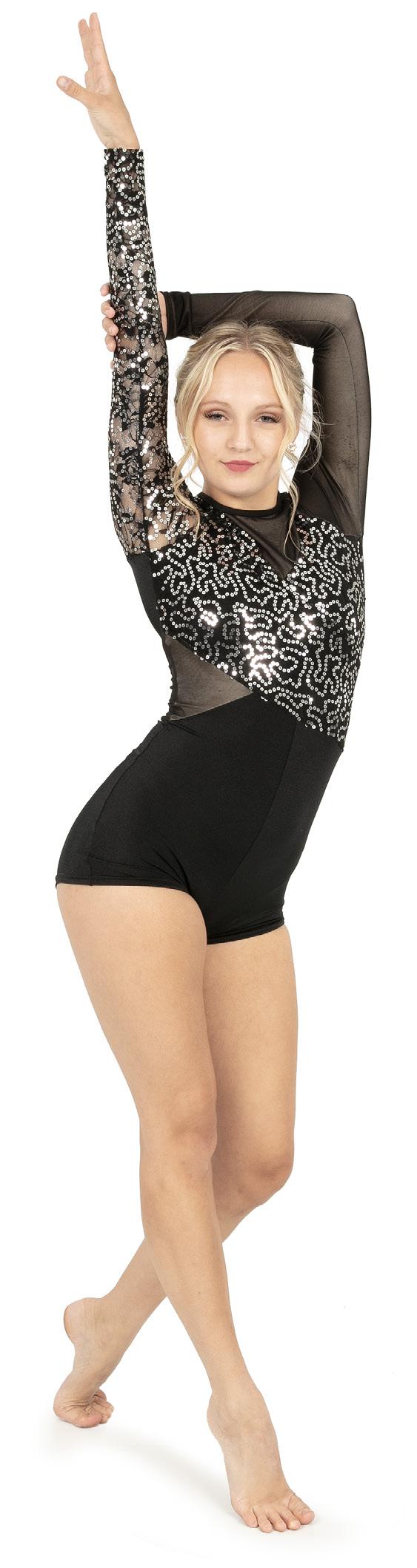 • Long sleeve sequin tunic with a black tricot back, black power mesh sleeves, with sequin cuffs.