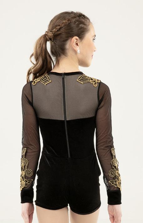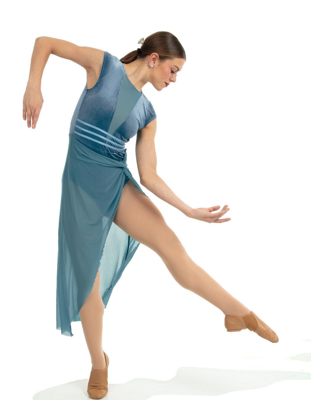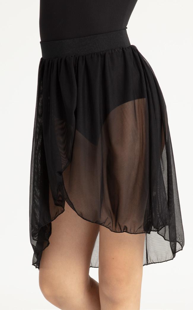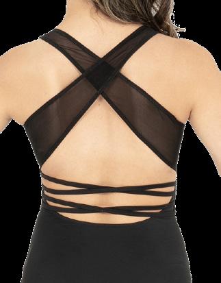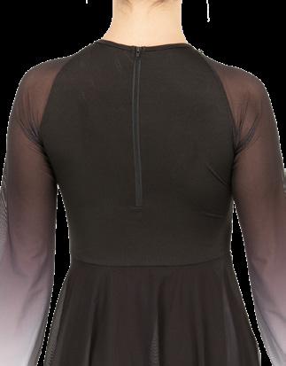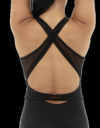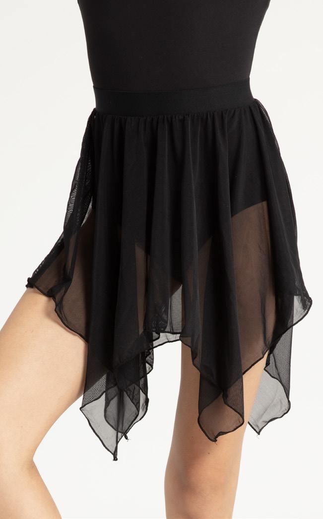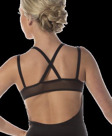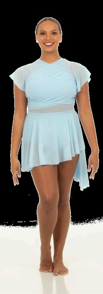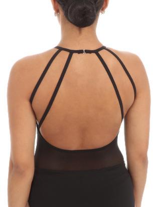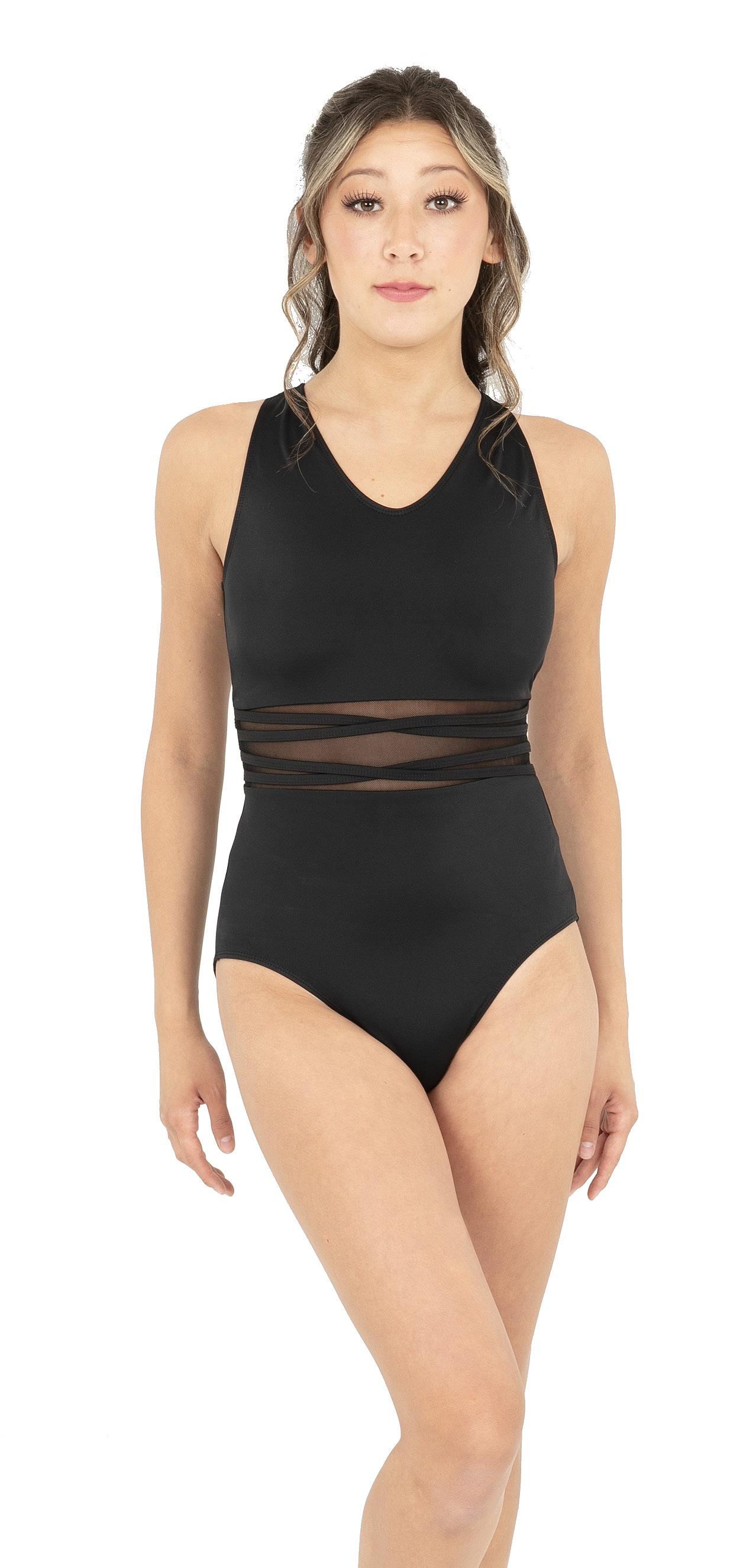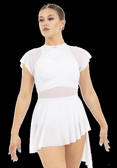 • Skirted leotard with mesh panels at midriff and front bodice.