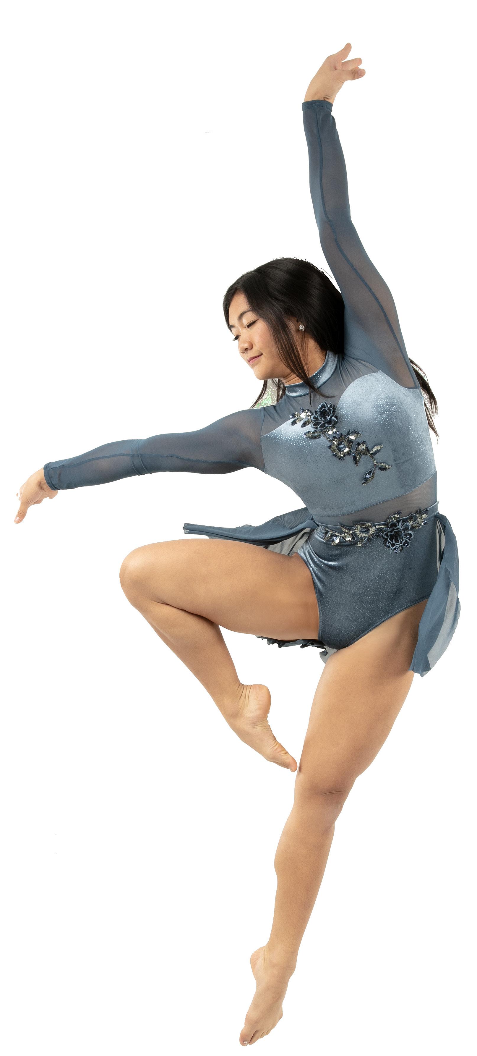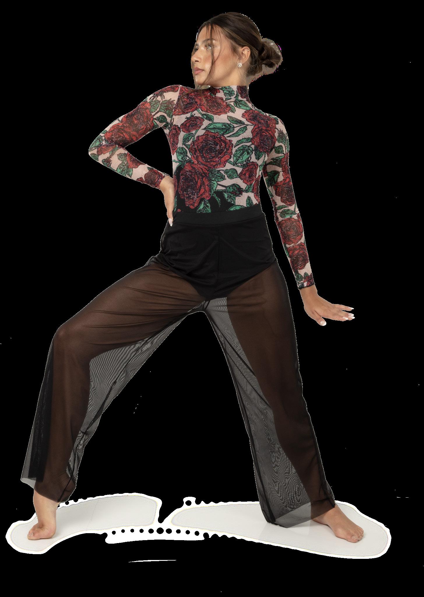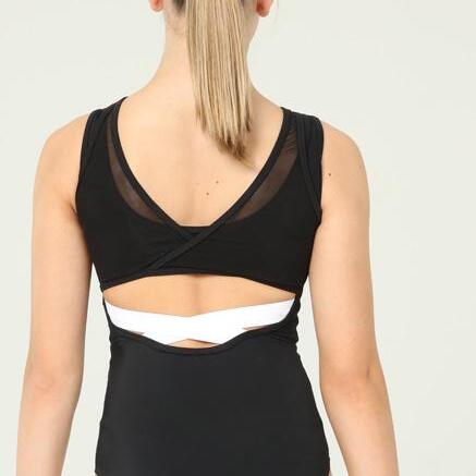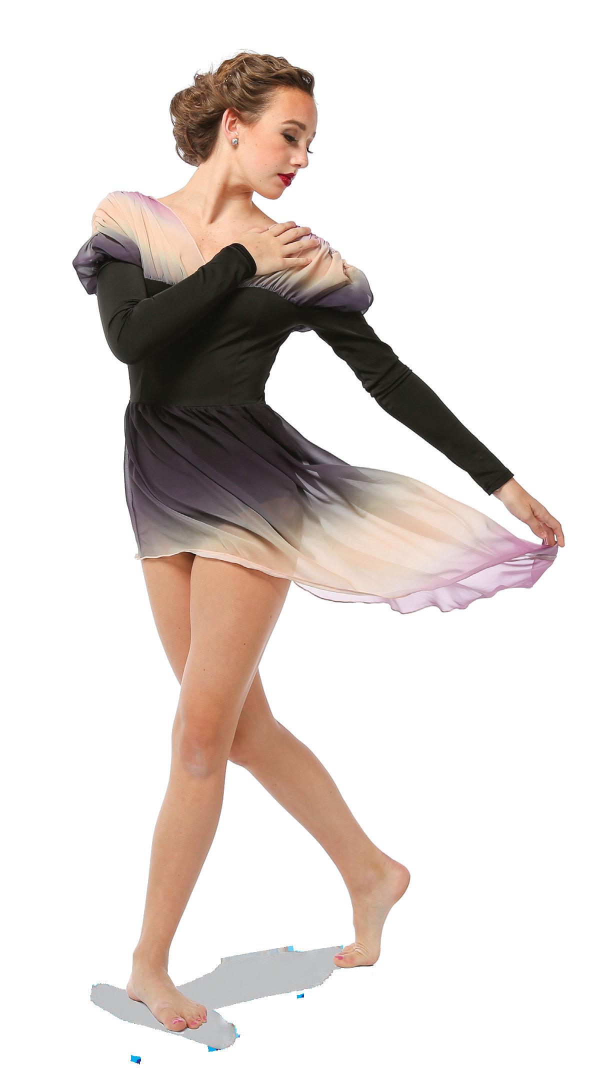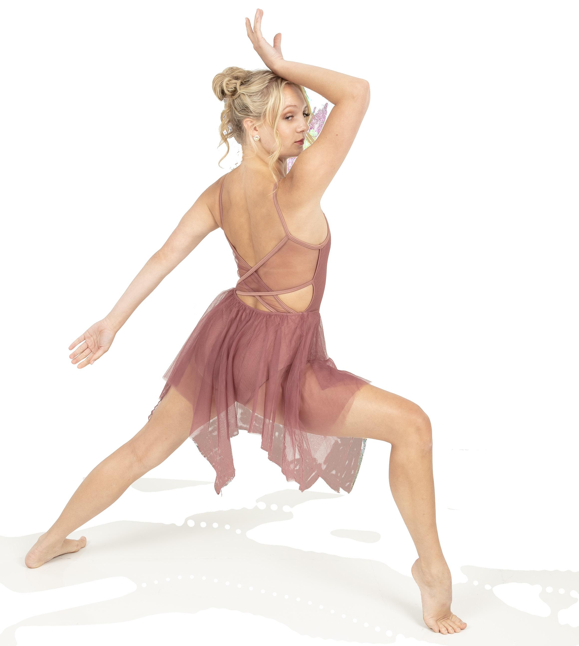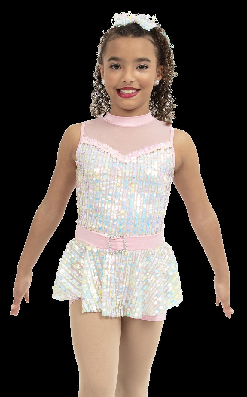 • Skirted leotard with mesh panels at midriff and front bodice.