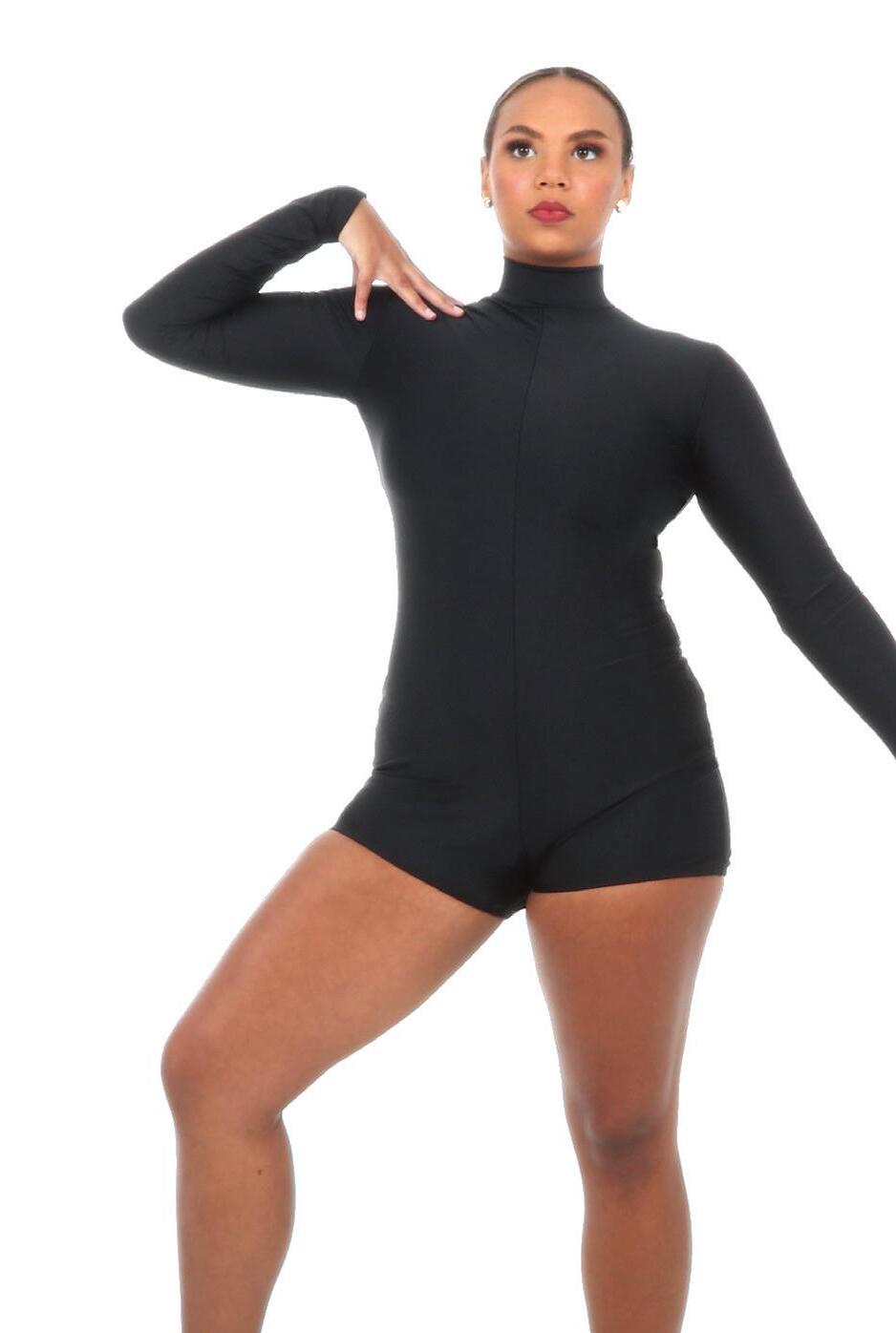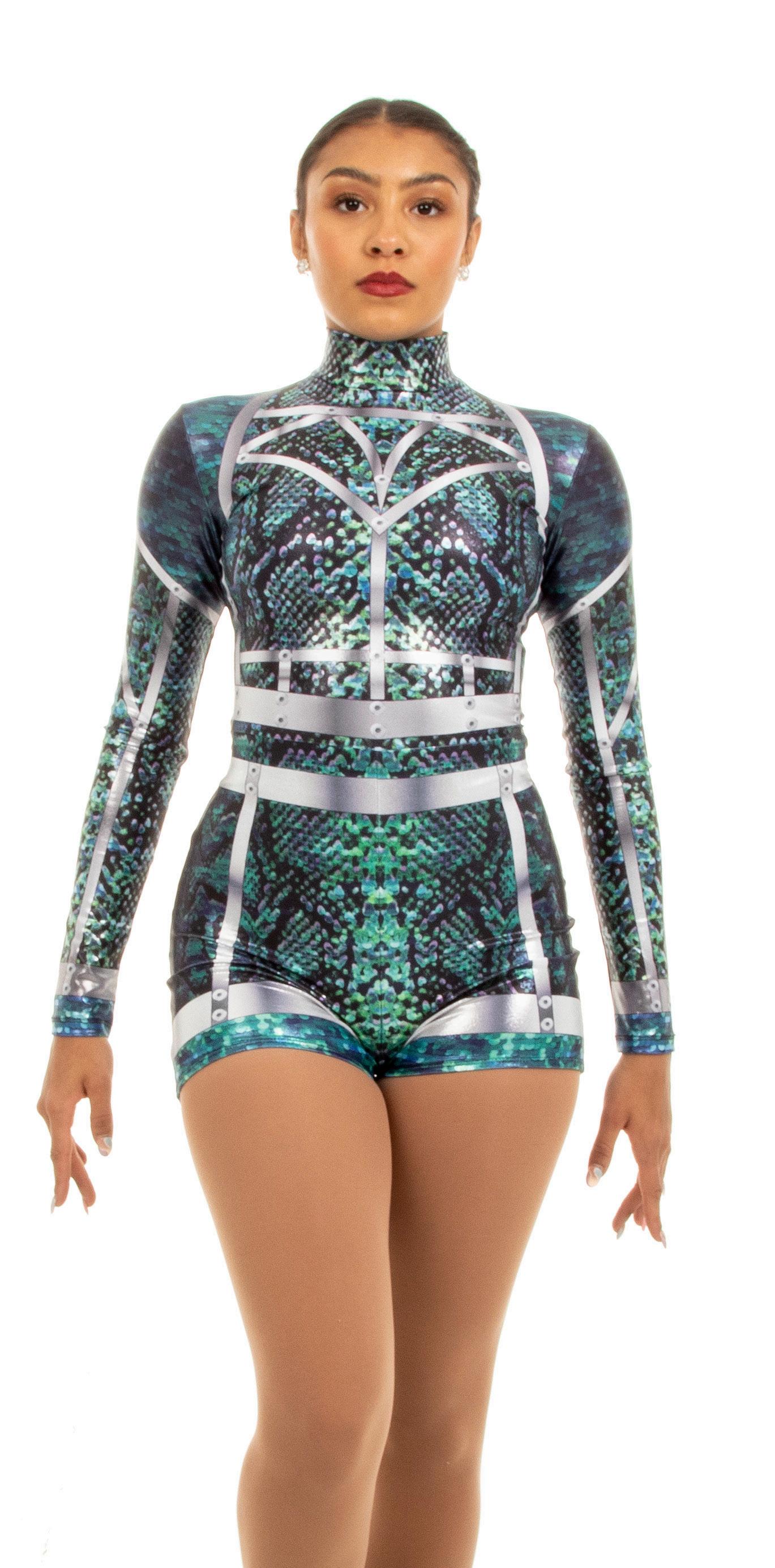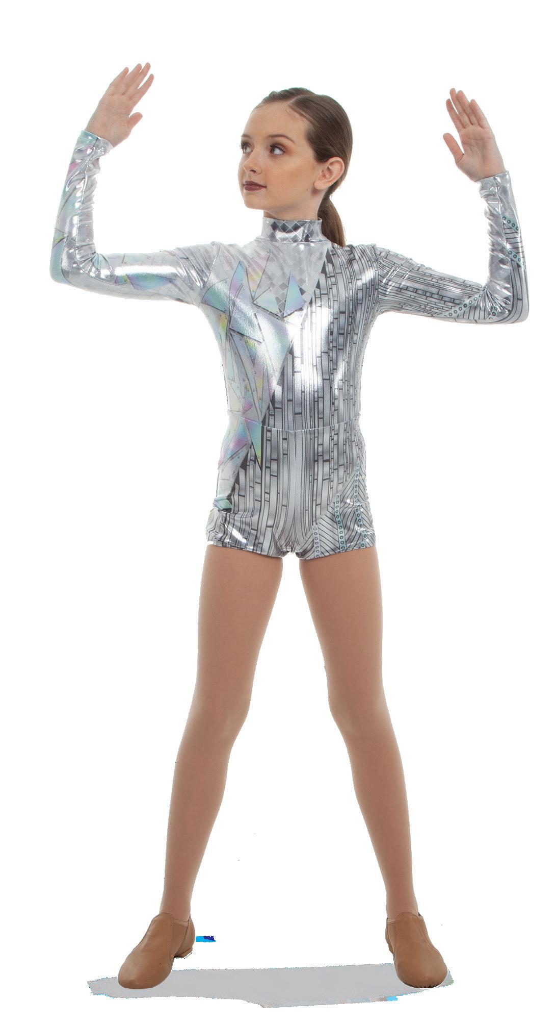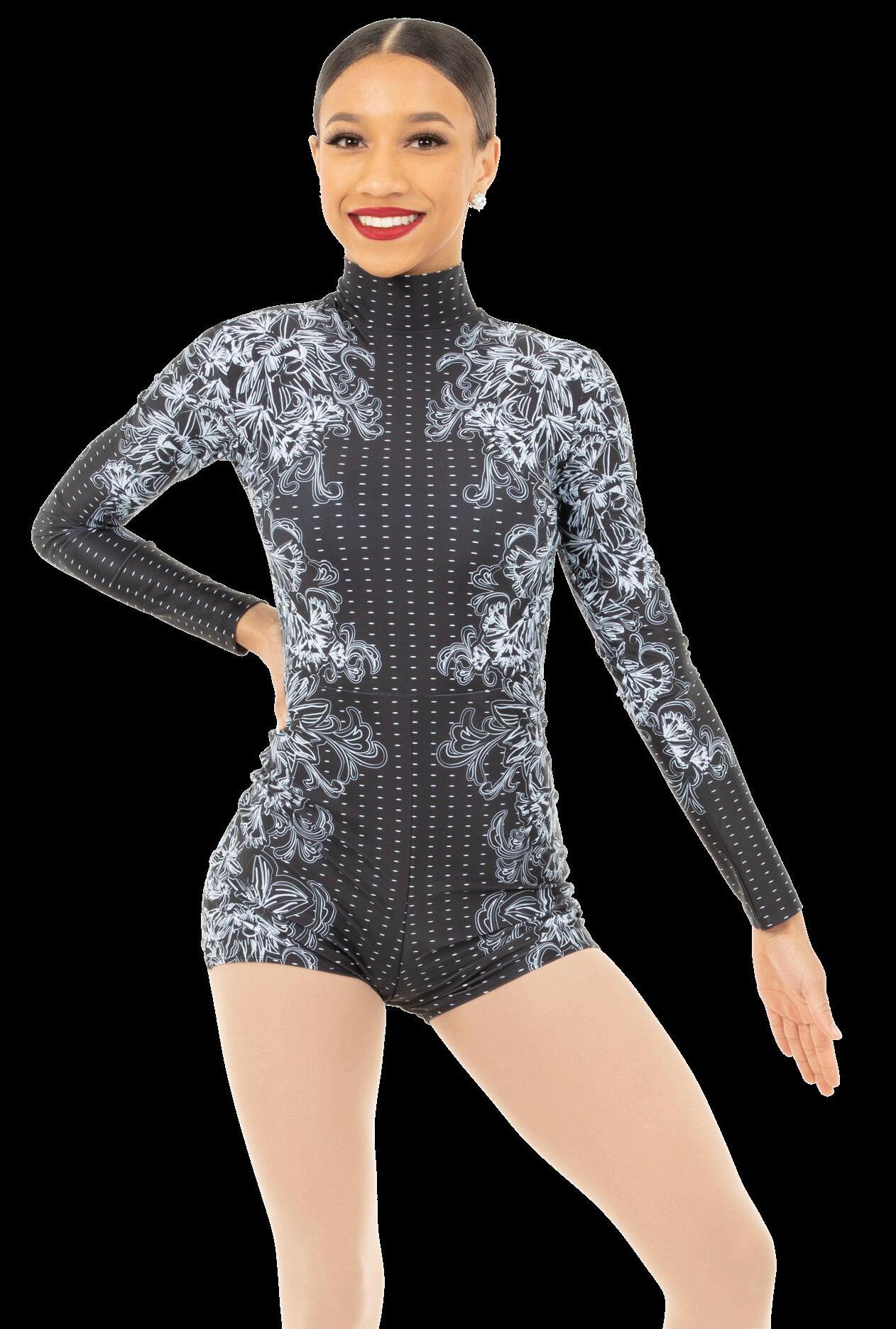 • Dye-sublimated long sleeve mock neck foil biketard.