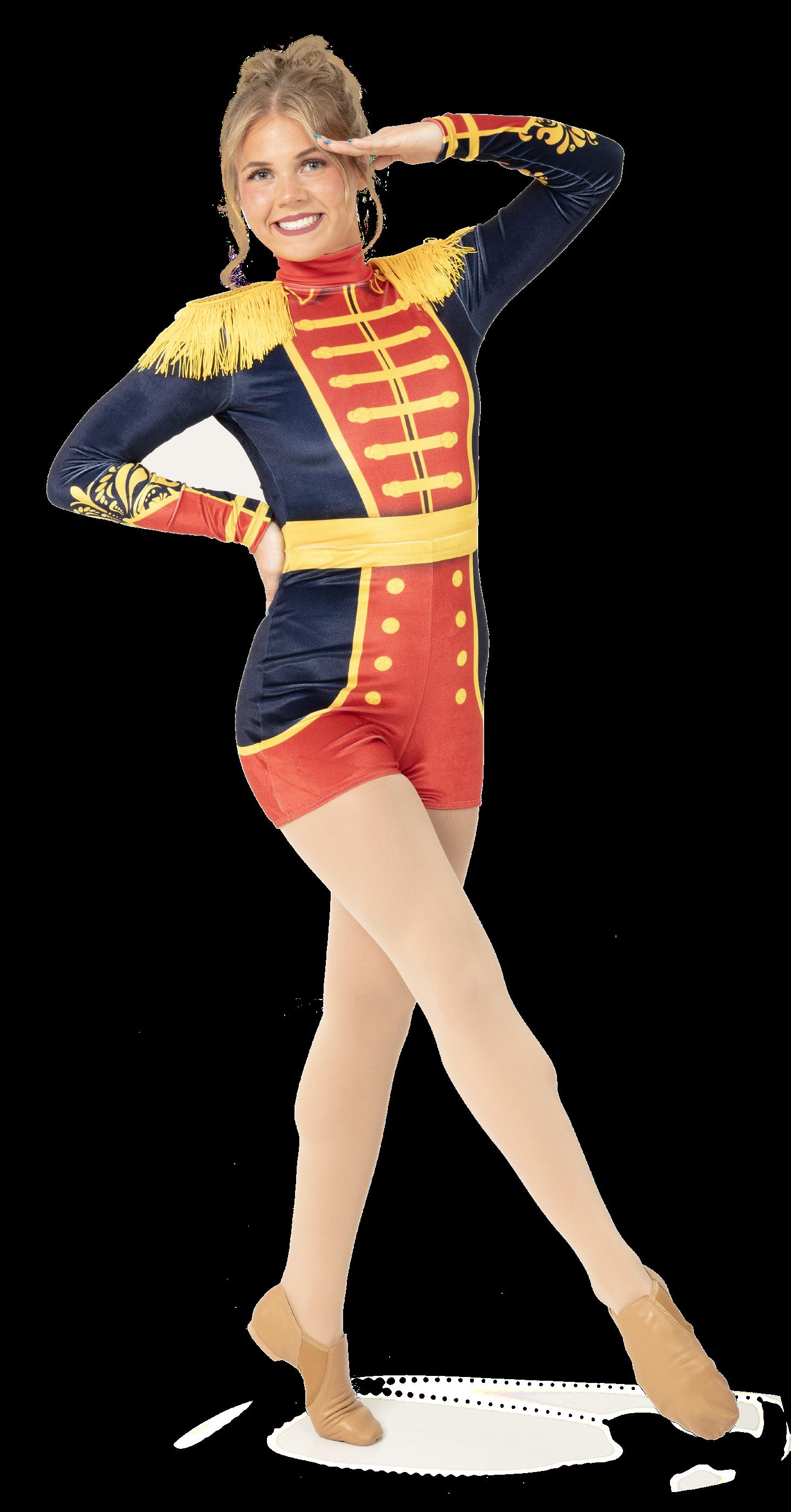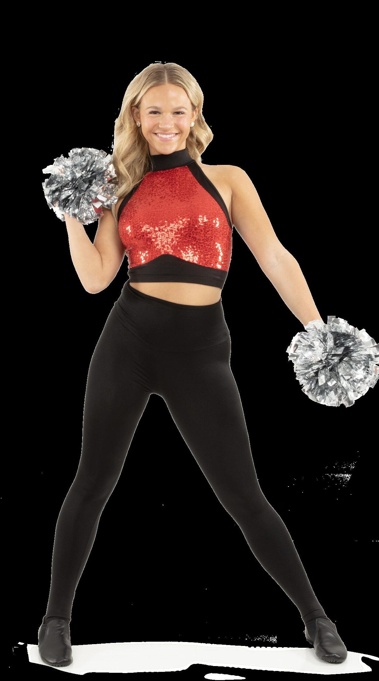 Black Tricot, Nylon, Spandex. Colors: Red, Gold, Silver or Royal.