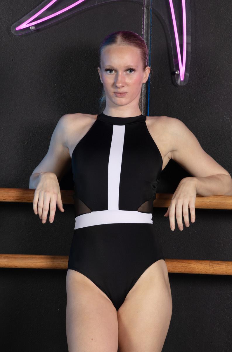 Sleek high neckline and eye-catching side cutouts. Piping along the princess seams. Soft binding at the armholes and leg openings. Fully lined.