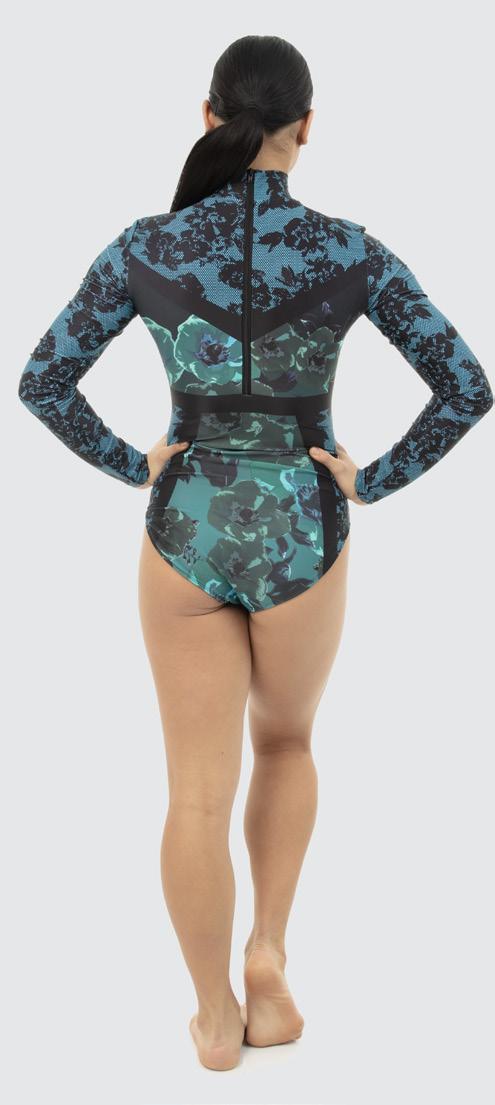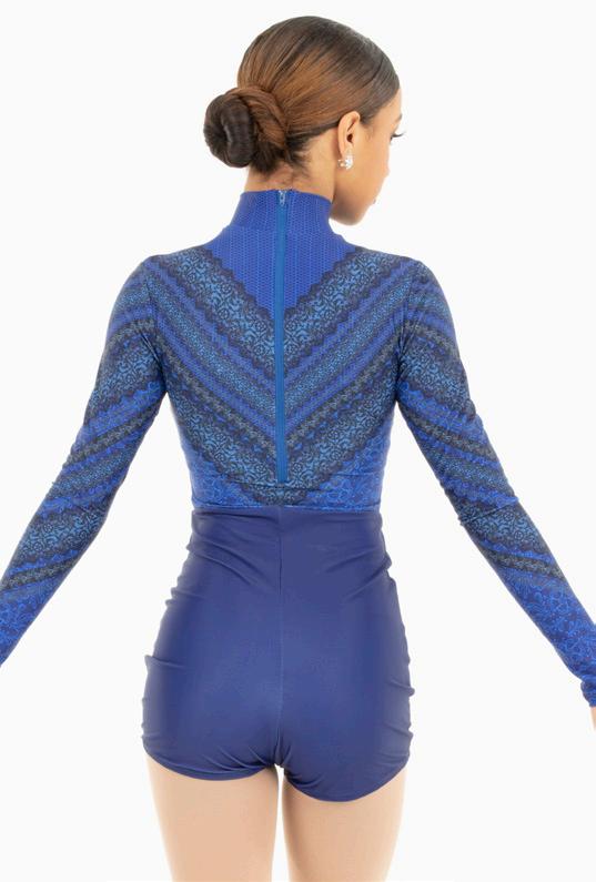 Alexandra. Long-sleeve dye-sublimation biketard featuring a striking artistic design of brush strokes on a contrasting background. Mock neck collar, Front lined. Center back zipper closure. Polyester, Spandex.