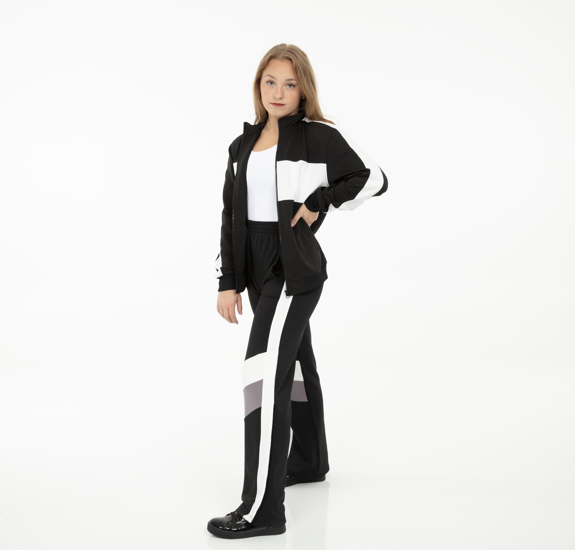 fabric offset with asymmetrical back tricot panels is perfect for the whole team. Mock neckband and center back zipper closure. Long tricot sleeves. Lining under sequin panels for comfort.