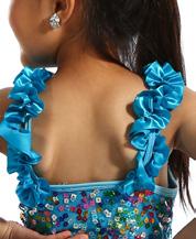 Alexandra. Ruffled sequin skirted leotard. The front body consists of multi-color sequins, while the back is full tricot stretch fabric. Spaghetti elastic binding straps with a horsehair ruffle hem. The skirt consists of three layers in teal, turquoise and lime green. Polyester, Spandex.