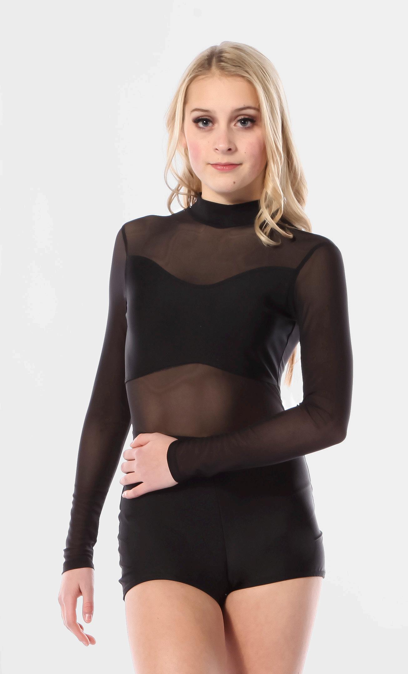 Alexandra. Illusion sequin bodice biketard features a rhinestone applique, long mesh sleeves, front and back upper mesh panel. The front and back upper mesh panels are tricot lined for full coverage. Center back zipper closure. Nylon, Spandex.