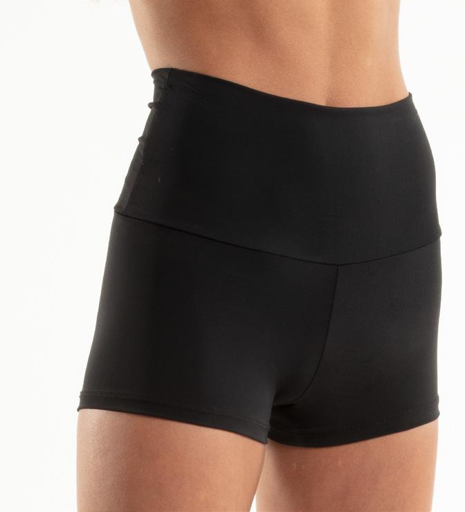 Alexandra. Biketard with illusion mesh neckline with straps, sequin bodice, raglan short sleeves, and keyhole back. The biketard is accented with a waistband, and side bustle for extra detail. Front lined bodice, with black tricot shorts. Center back G-hook closure. Nylon, Spandex.