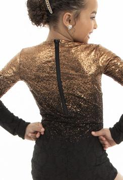 Alexandra. This romantic long sleeve biketard features sequin tricot panels, and stretch mesh panels with a keyhole mesh back. G-hook closure. Fully Lined under sequin panels. Enclosed elastic and lining around leg opening for comfort.