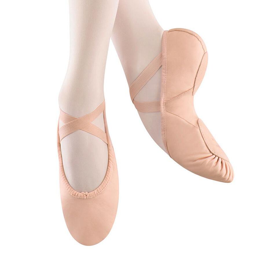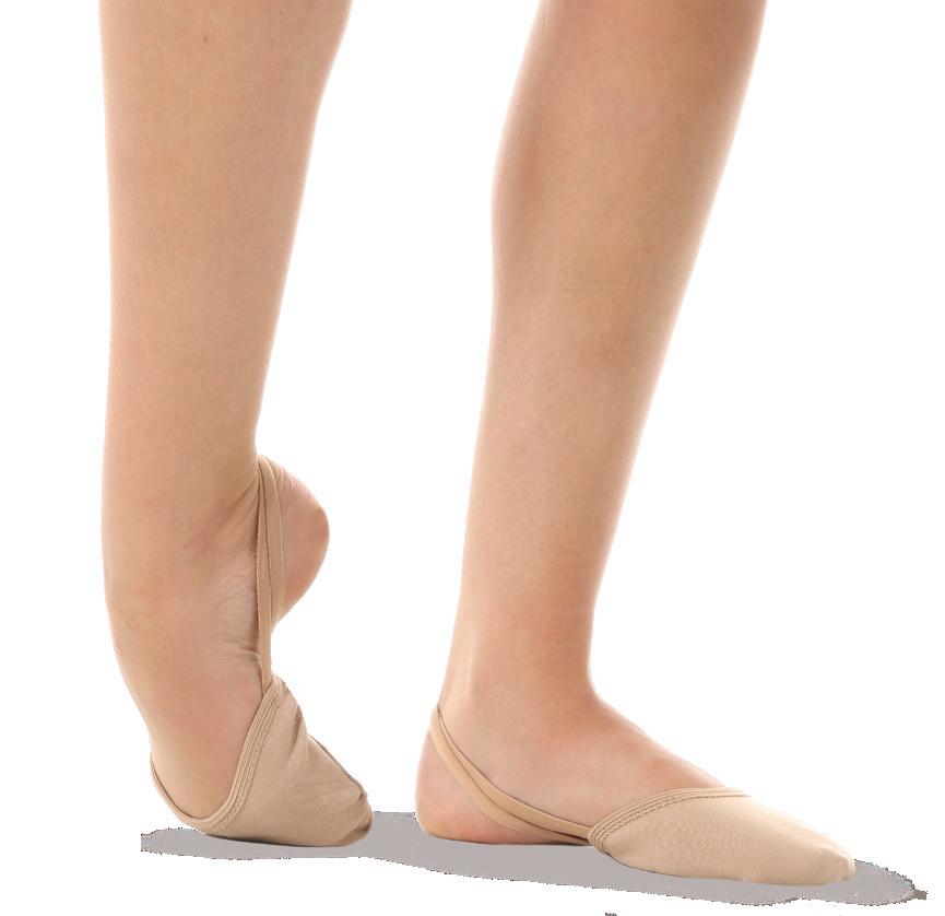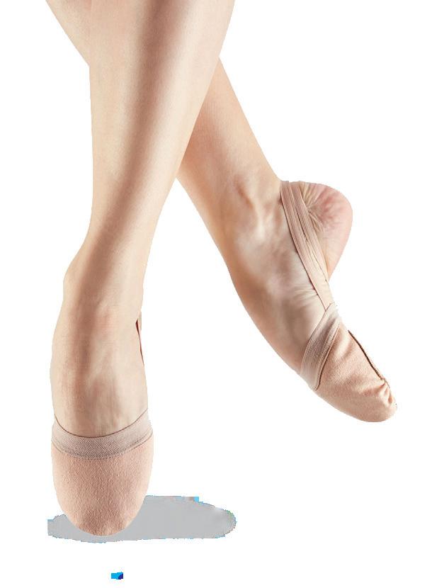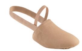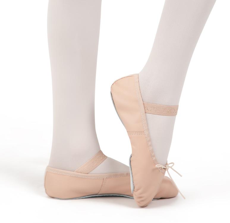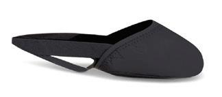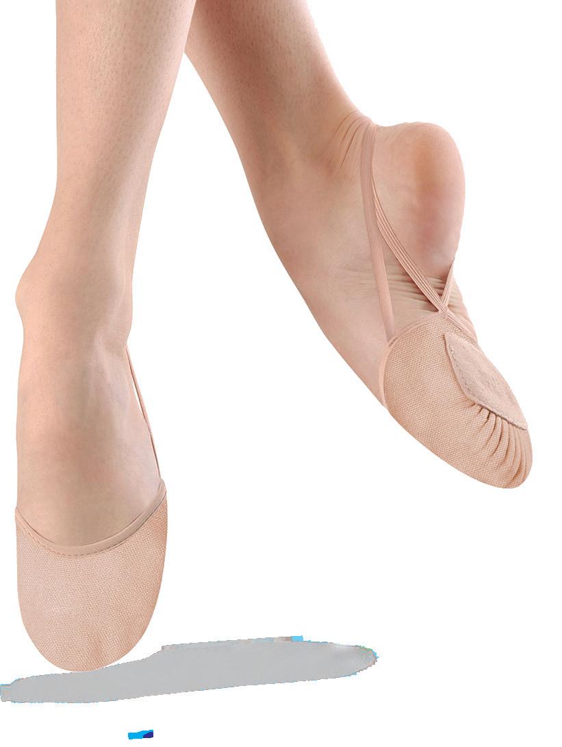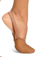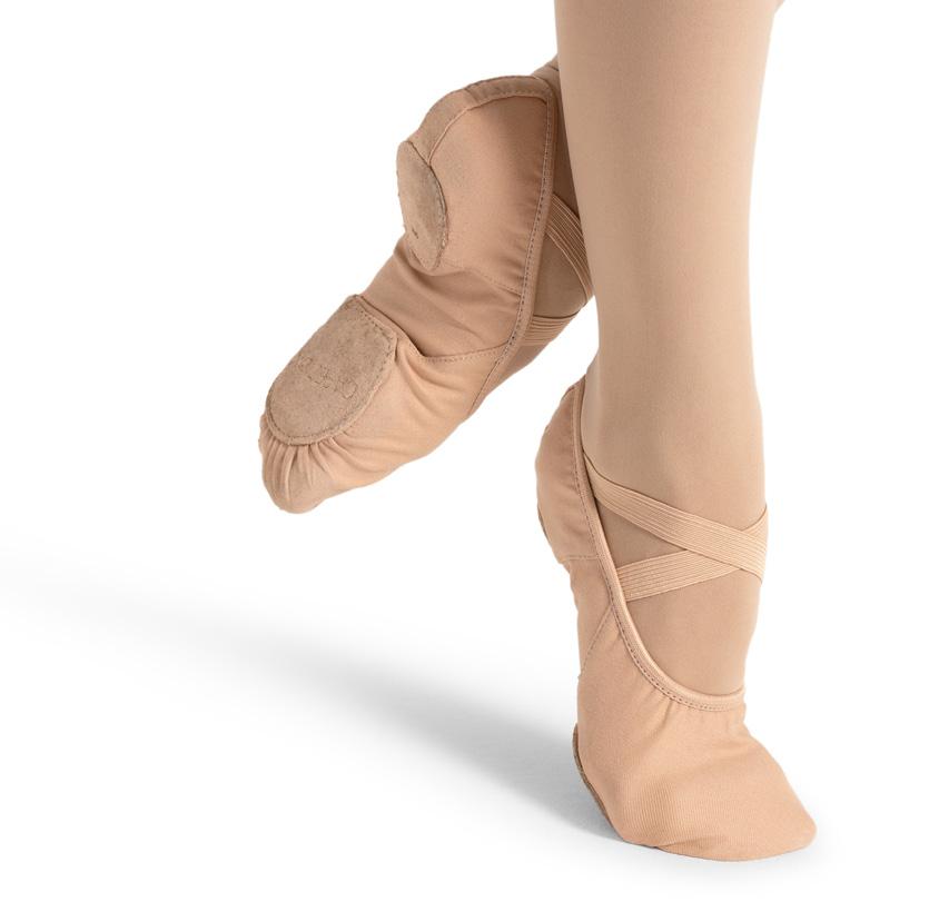 Split-sole ballet shoe with a 4-way stretch canvas upper, absorbent lining. Streamlined fitting to reflect the contours of the foot. Pre-sewn elastic straps. Colors: Black, Lt. Pink or Nude (adult only). Sizes: