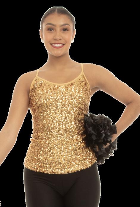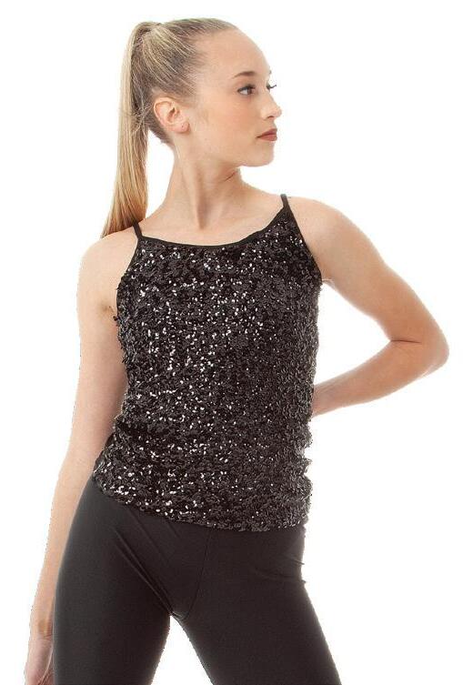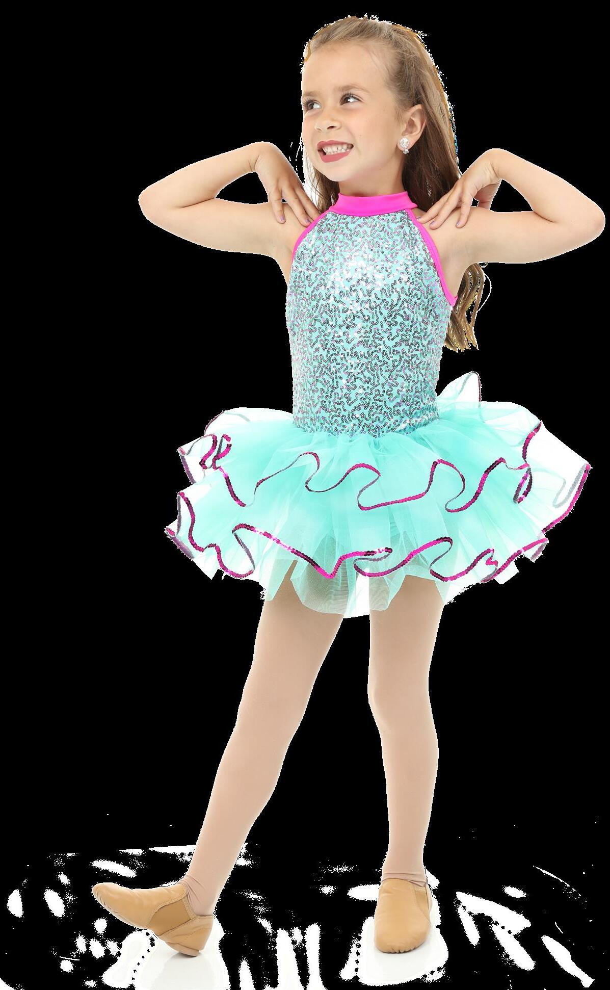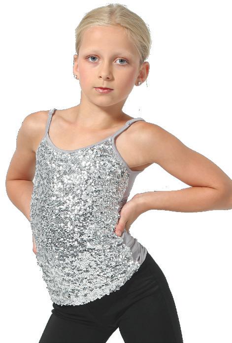 Scoop neck tank skirted leotard with a sequin front bodice, layered sparkle tulle tutu, tricot back with wide criss cross straps. Tricot waistband. Binding around the armhole and neckline. Front lined. Polyester, Spandex.