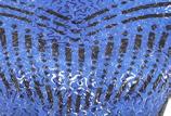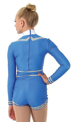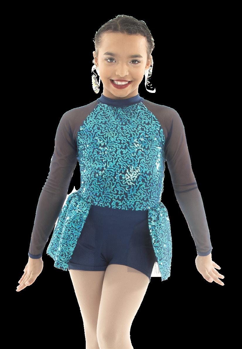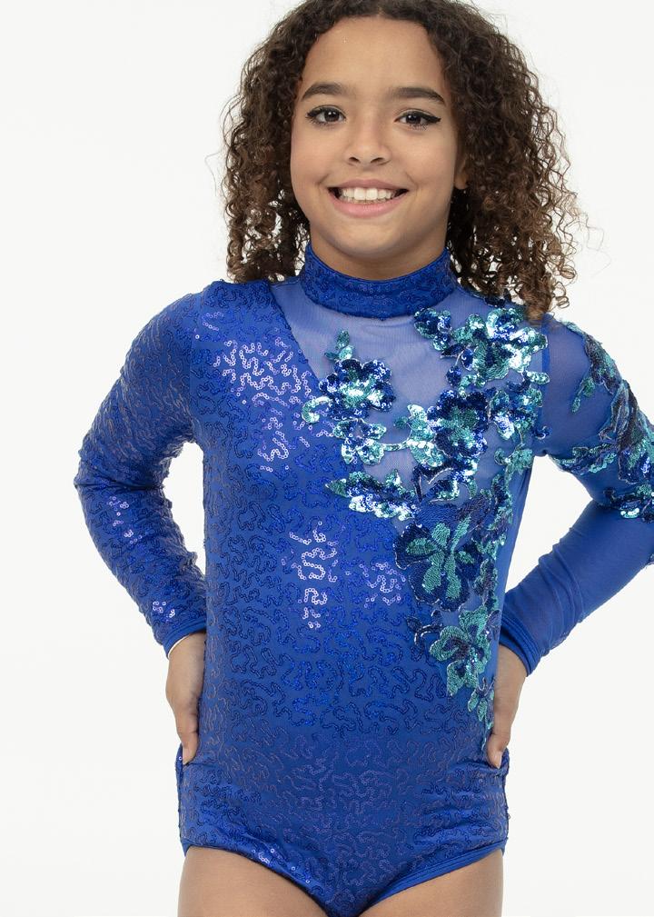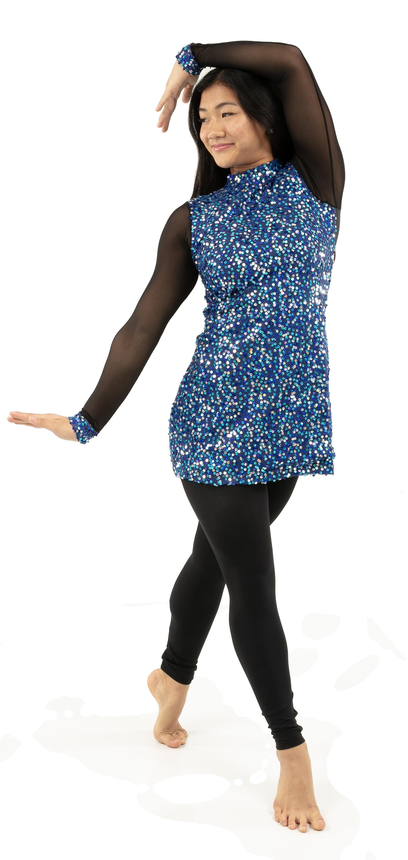 Alexandra. This sequin peplum skirted biketard features a blue iridescent sequin bodice, long mesh navy raglan sleeves, navy tricot shorts, and an upper mesh back keyhole with g-hook closure. Mock neckband. Front lined.