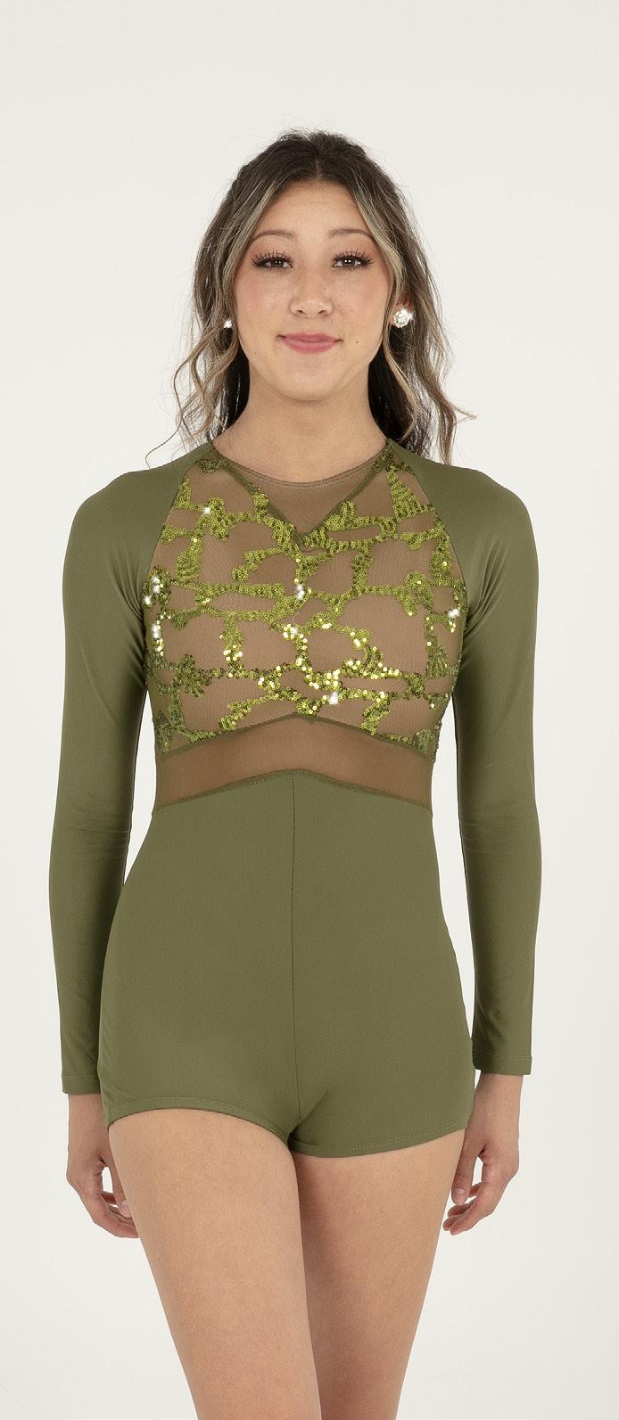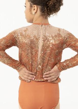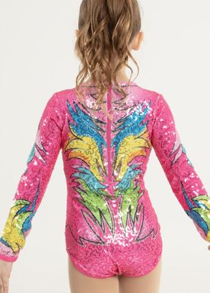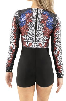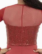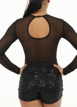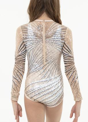 Alexandra. Sequin leotard with mocked raglan cut mesh sleeves with wider shoulder seams and an upper sequin back panel. Peek-a-boo lower mesh back panel. Front and back lined with binding along the neckline and leg opening. Center back zipper closure. Polyester, Nylon.