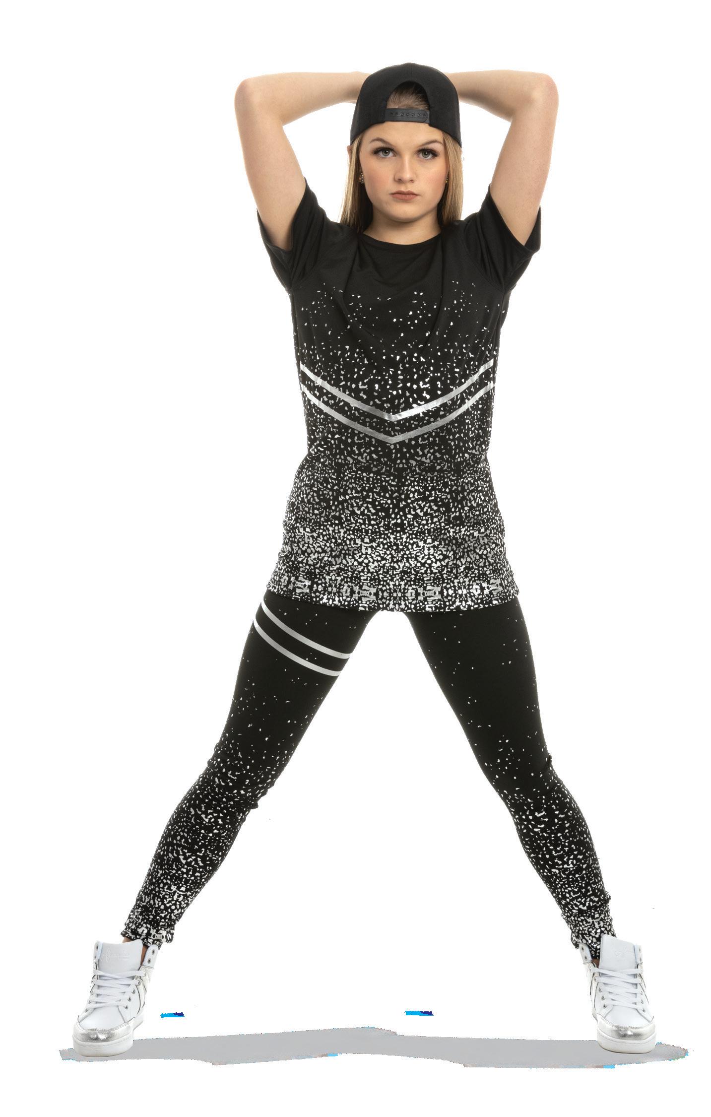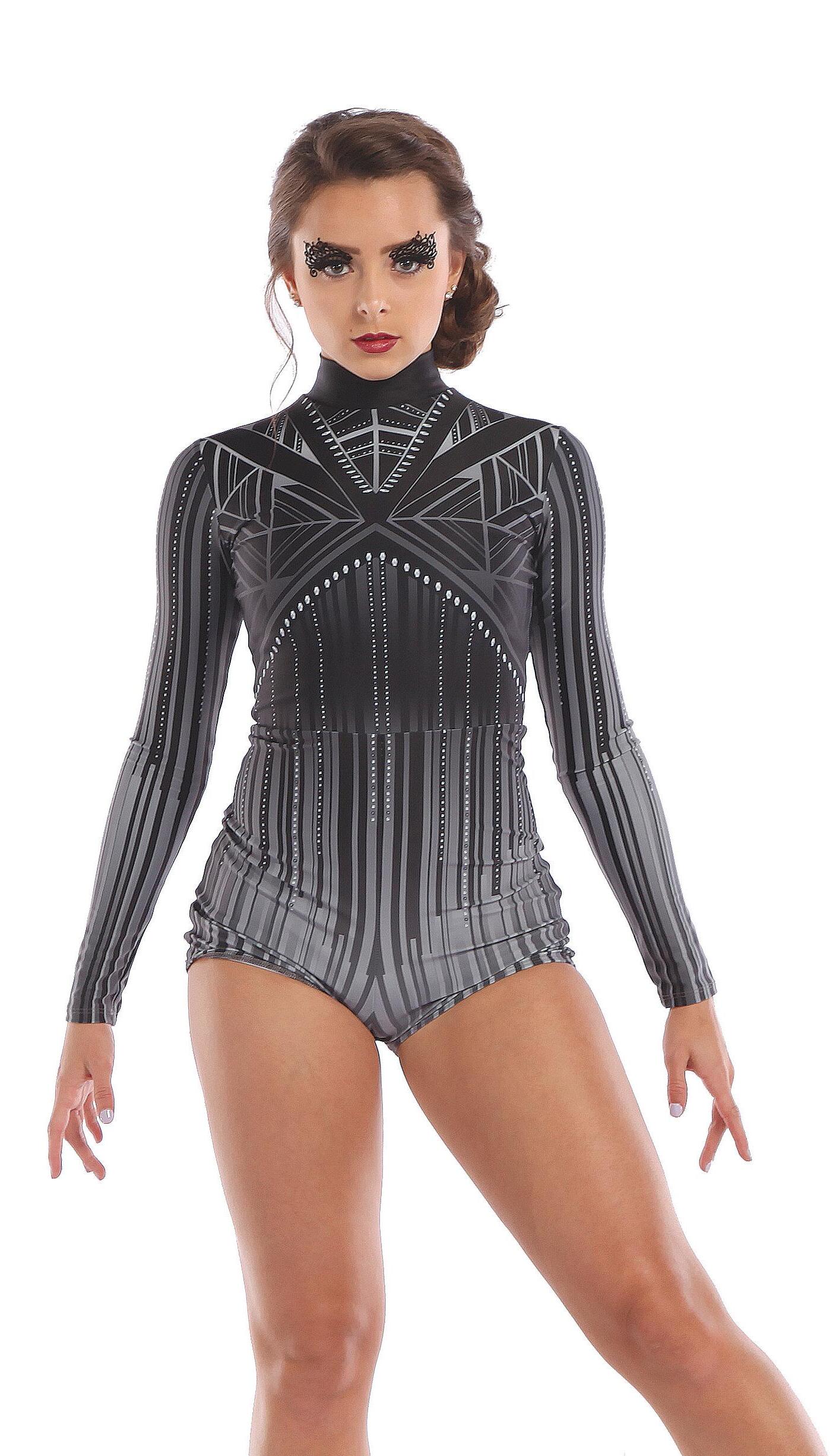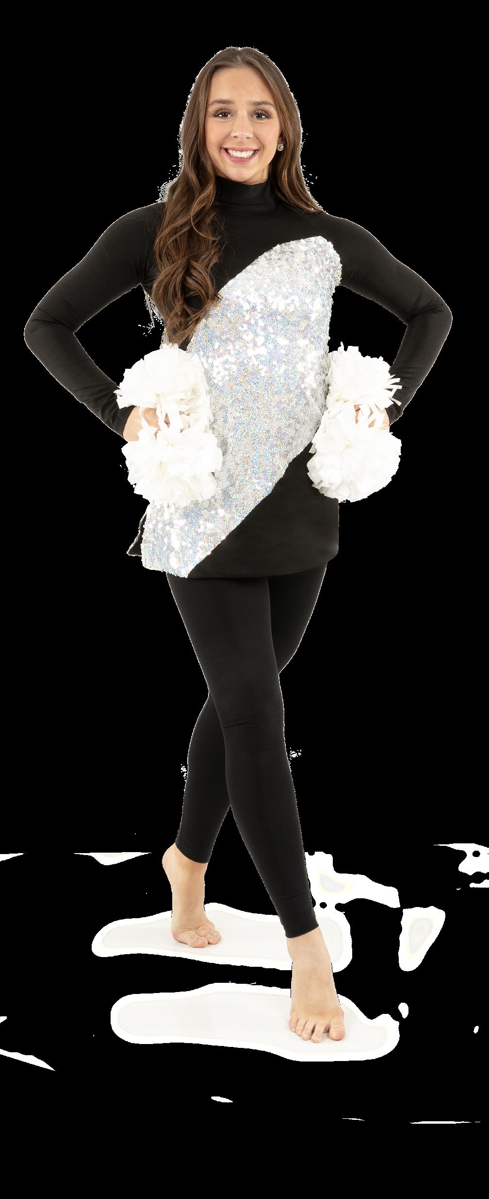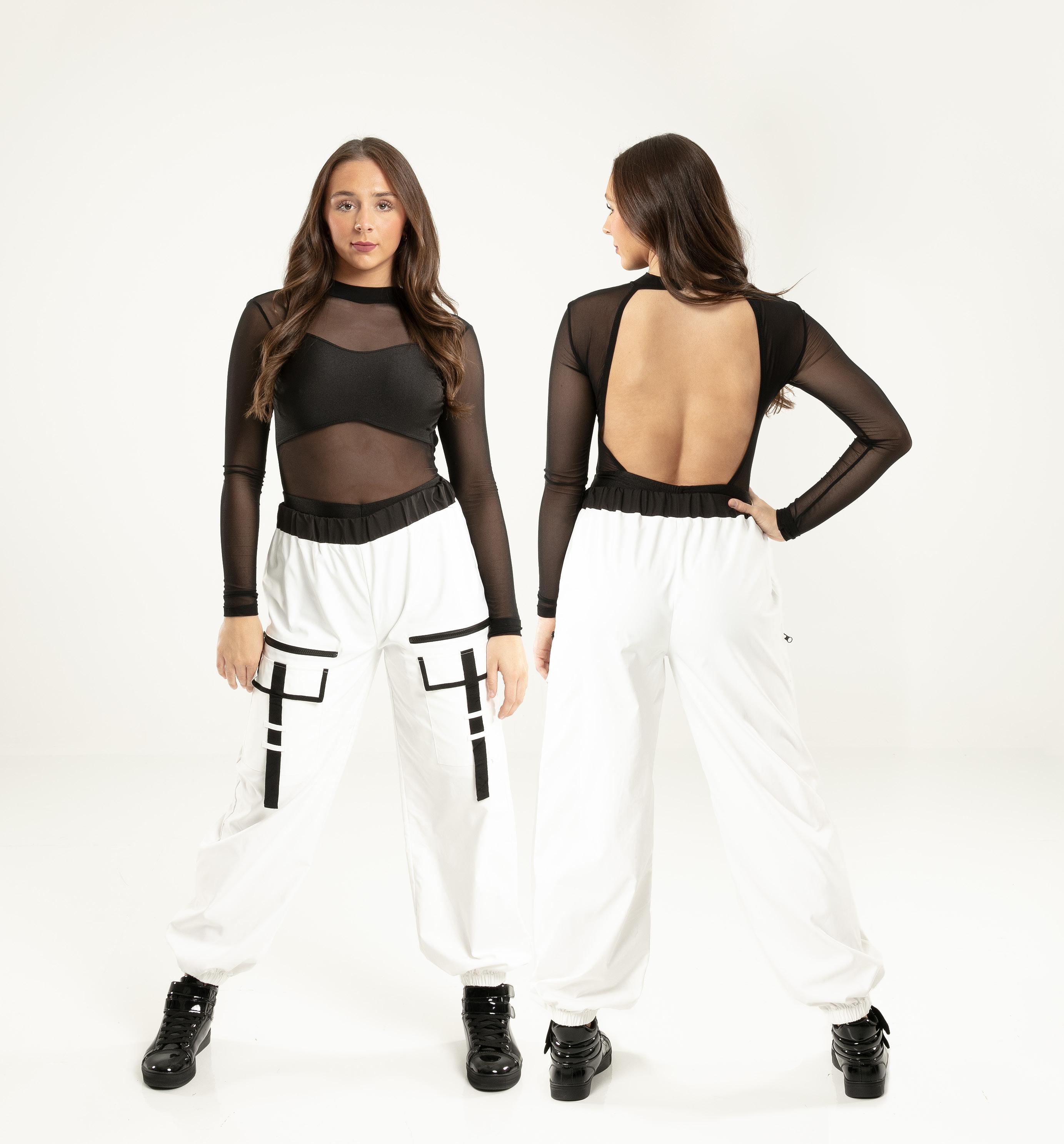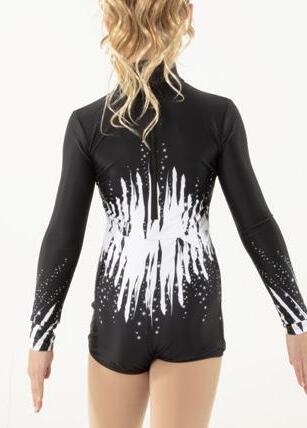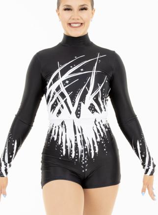 Alexandra. Black tricot-based leotard includes white foil panels along the upper body, down the sleeves, and midriff area. The extra detail of the added rhinestones makes this a perfect POM or Hip-hop performance piece. Comes with rhinestones already attached.