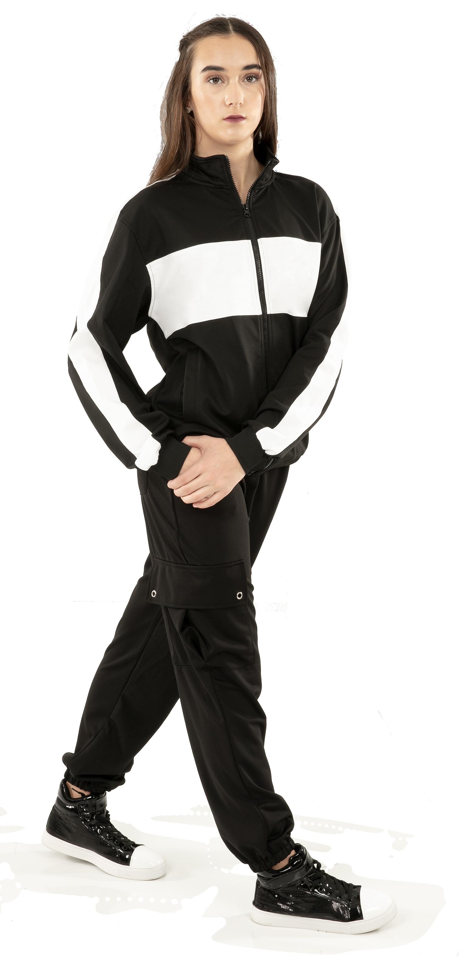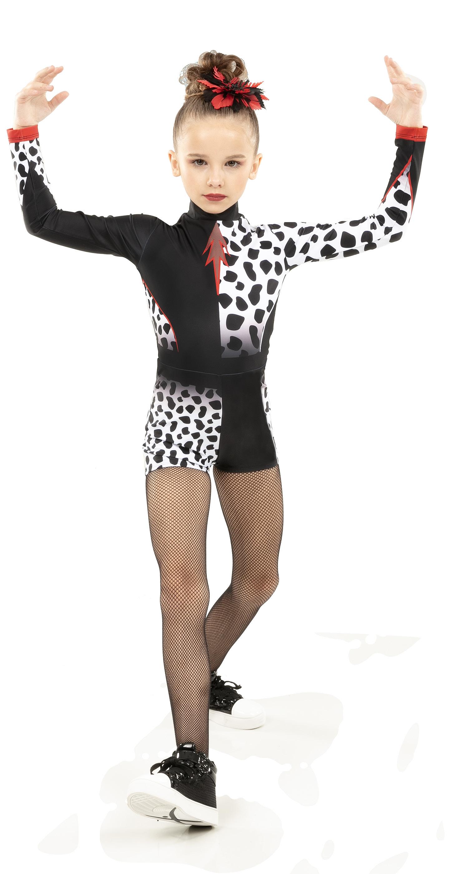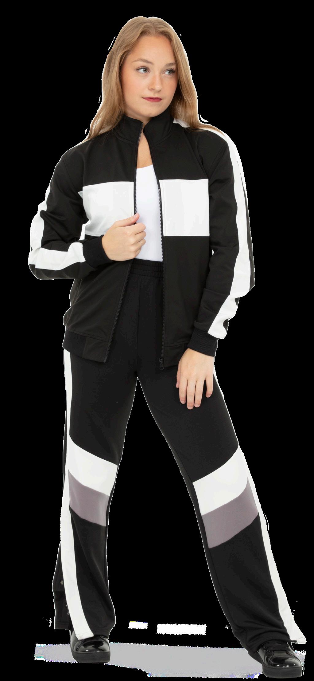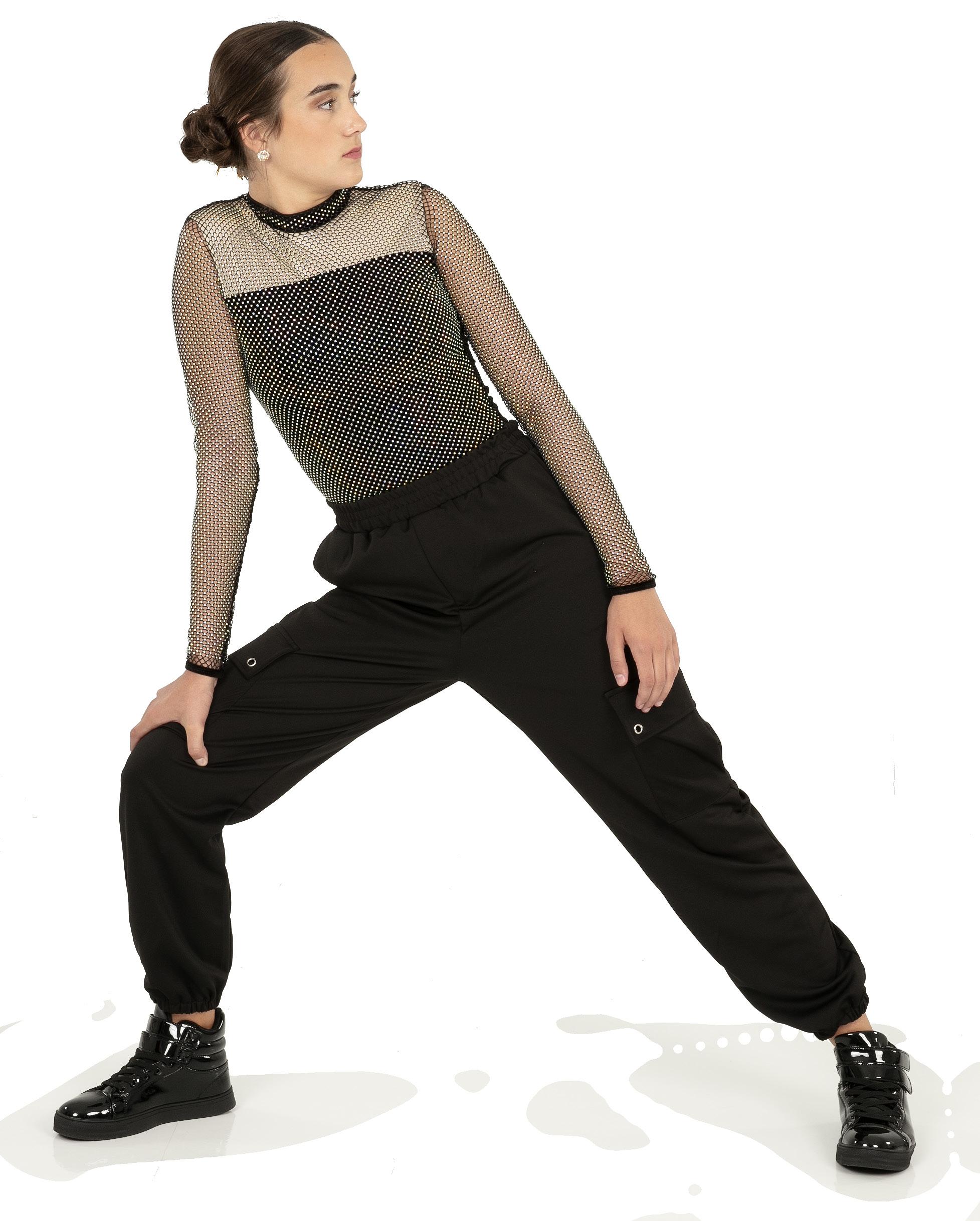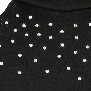 Alexandra. Black tricot-based leotard includes white foil panels along the upper body, down the sleeves, and midriff area. The extra detail of the added rhinestones makes this a perfect POM or Hip-hop performance piece. Comes with rhinestones already attached.