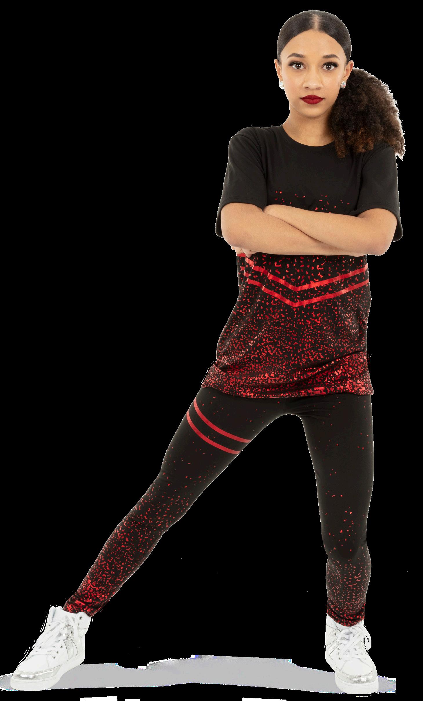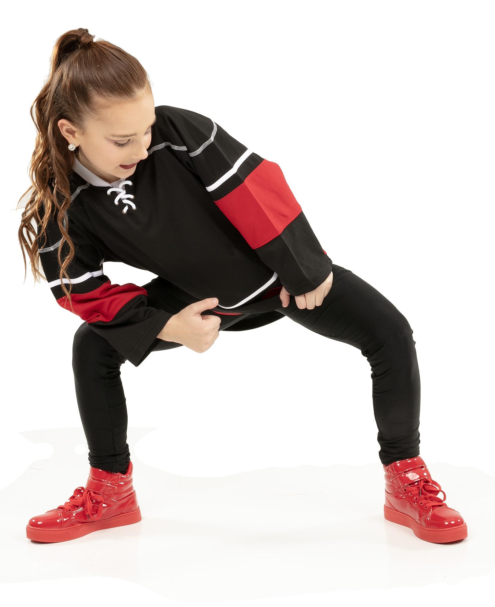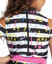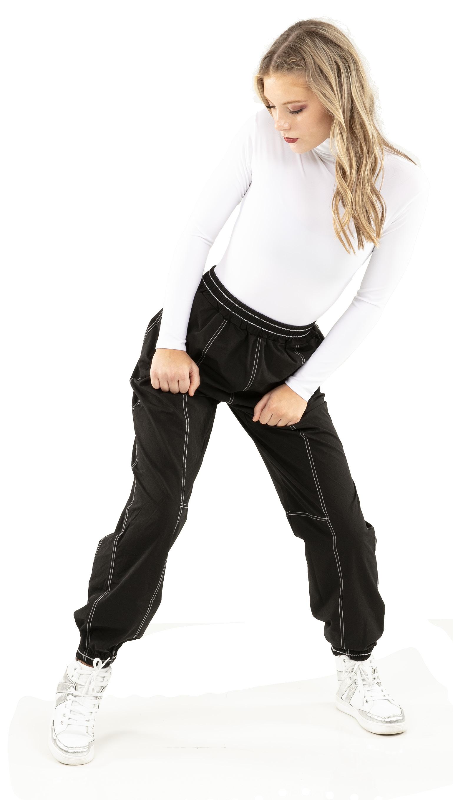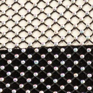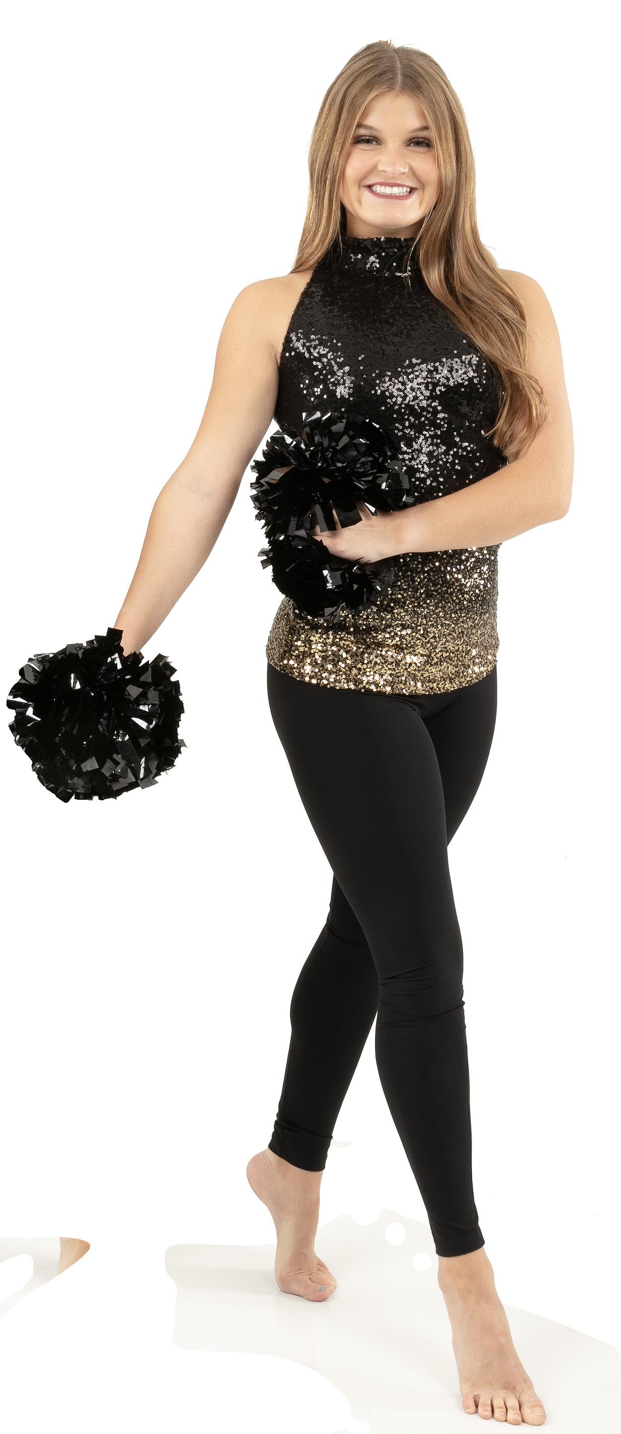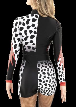 Alexandra. Black tricot-based leotard includes white foil panels along the upper body, down the sleeves, and midriff area. The extra detail of the added rhinestones makes this a perfect POM or Hip-hop performance piece. Comes with rhinestones already attached.