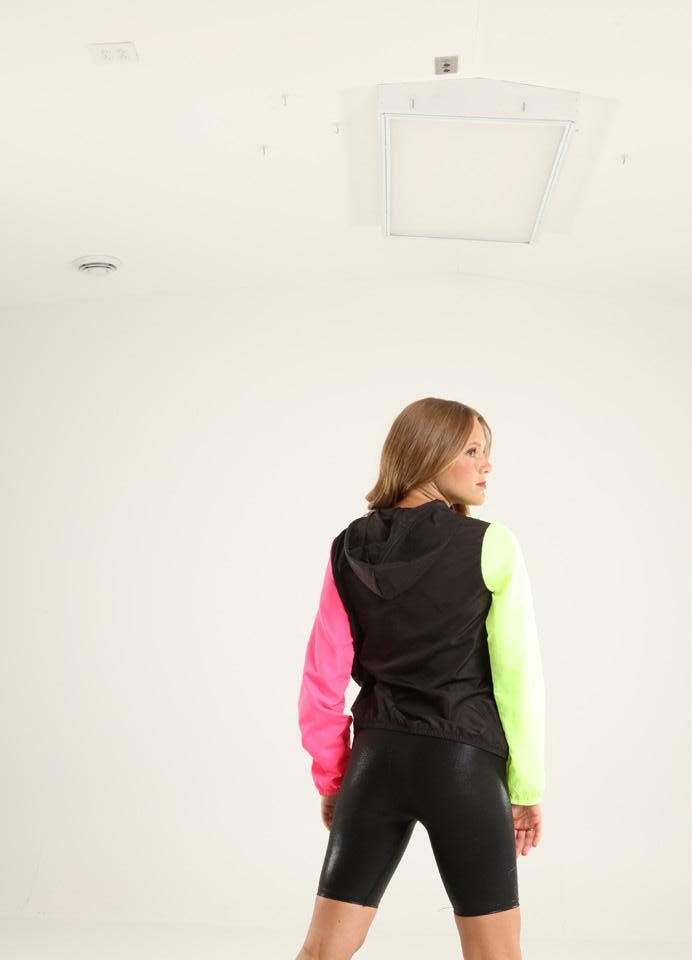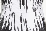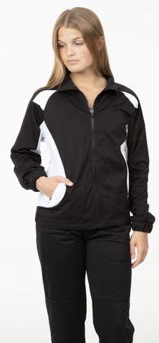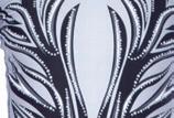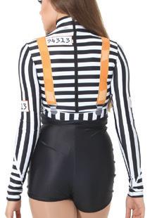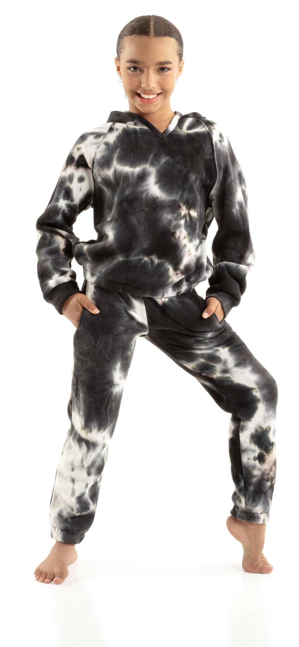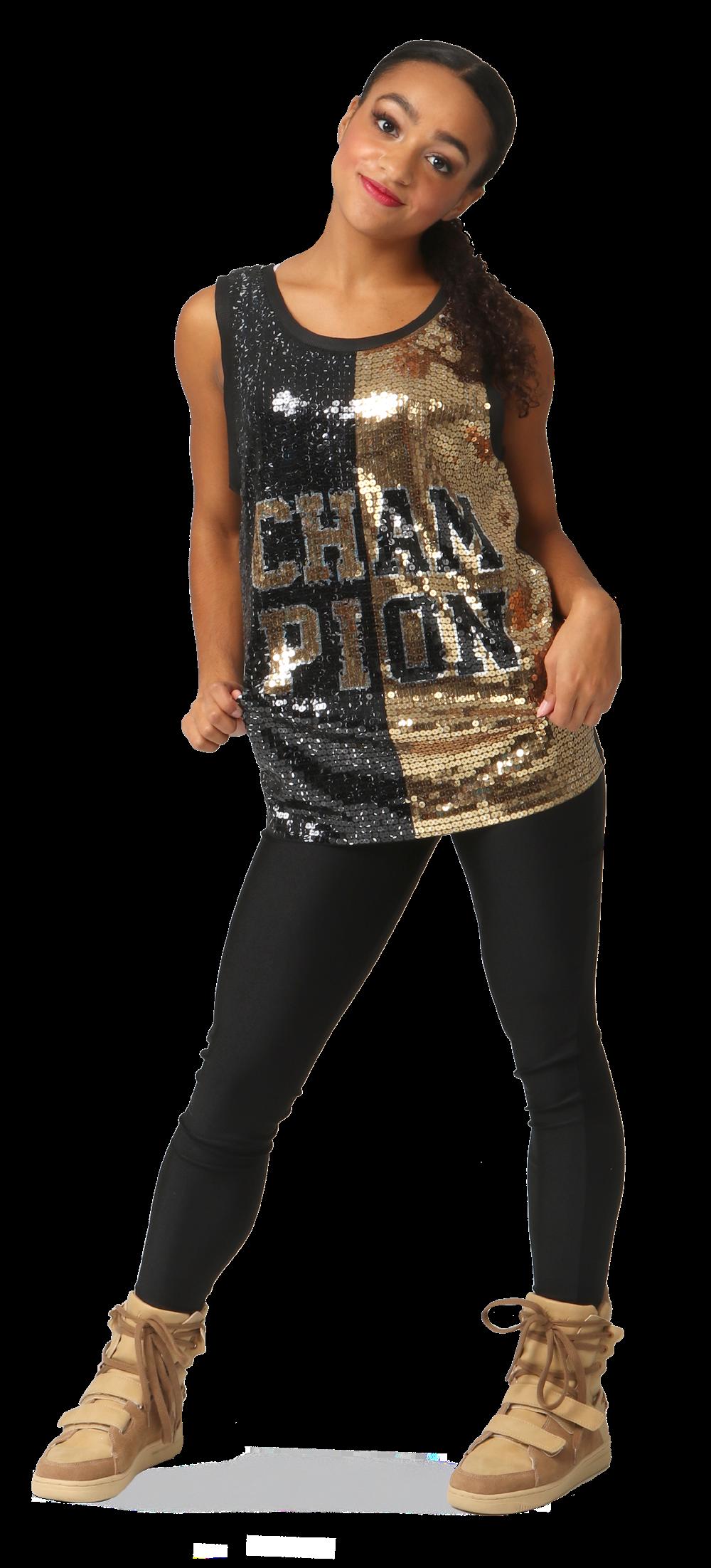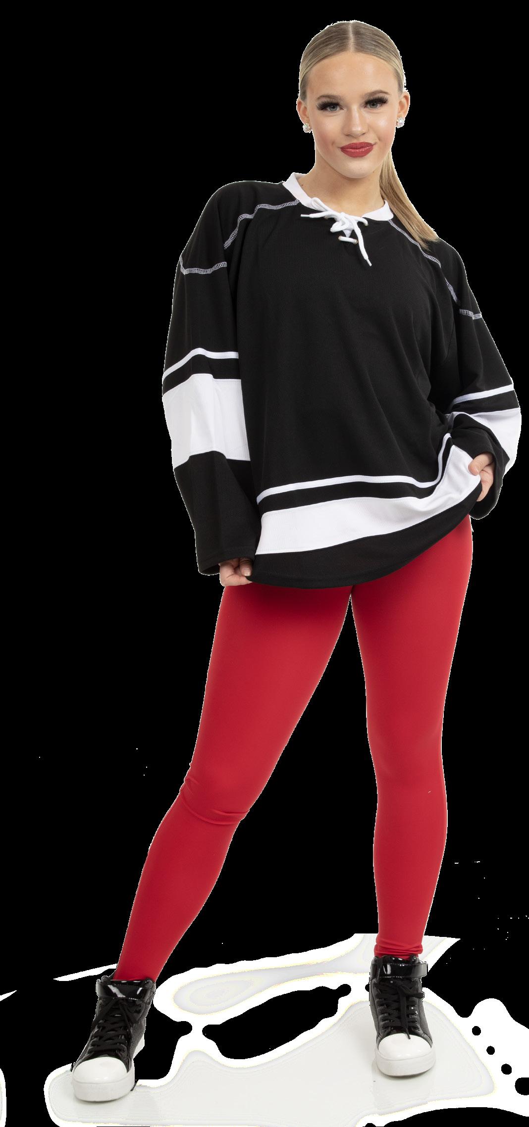 Alexandra. Black tricot-based leotard includes white foil panels along the upper body, down the sleeves, and midriff area. The extra detail of the added rhinestones makes this a perfect POM or Hip-hop performance piece. Comes with rhinestones already attached.