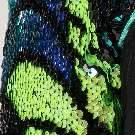 Alexandra. Long sleeve sequin tunic top front consists of multi-blue hue sequins, black tricot back, black power mesh sleeves, with sequin cuffs. Fully lined on the front bodice, neckband, cuffs for comfort. Tunic length for extra coverage. Center back zipper. Nylon, Spandex.
