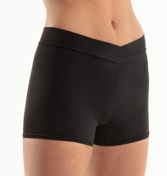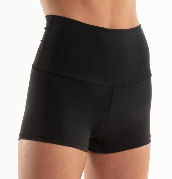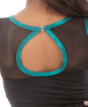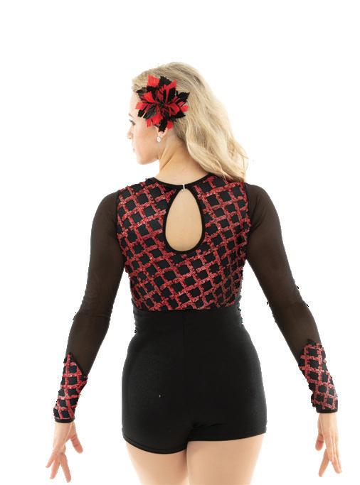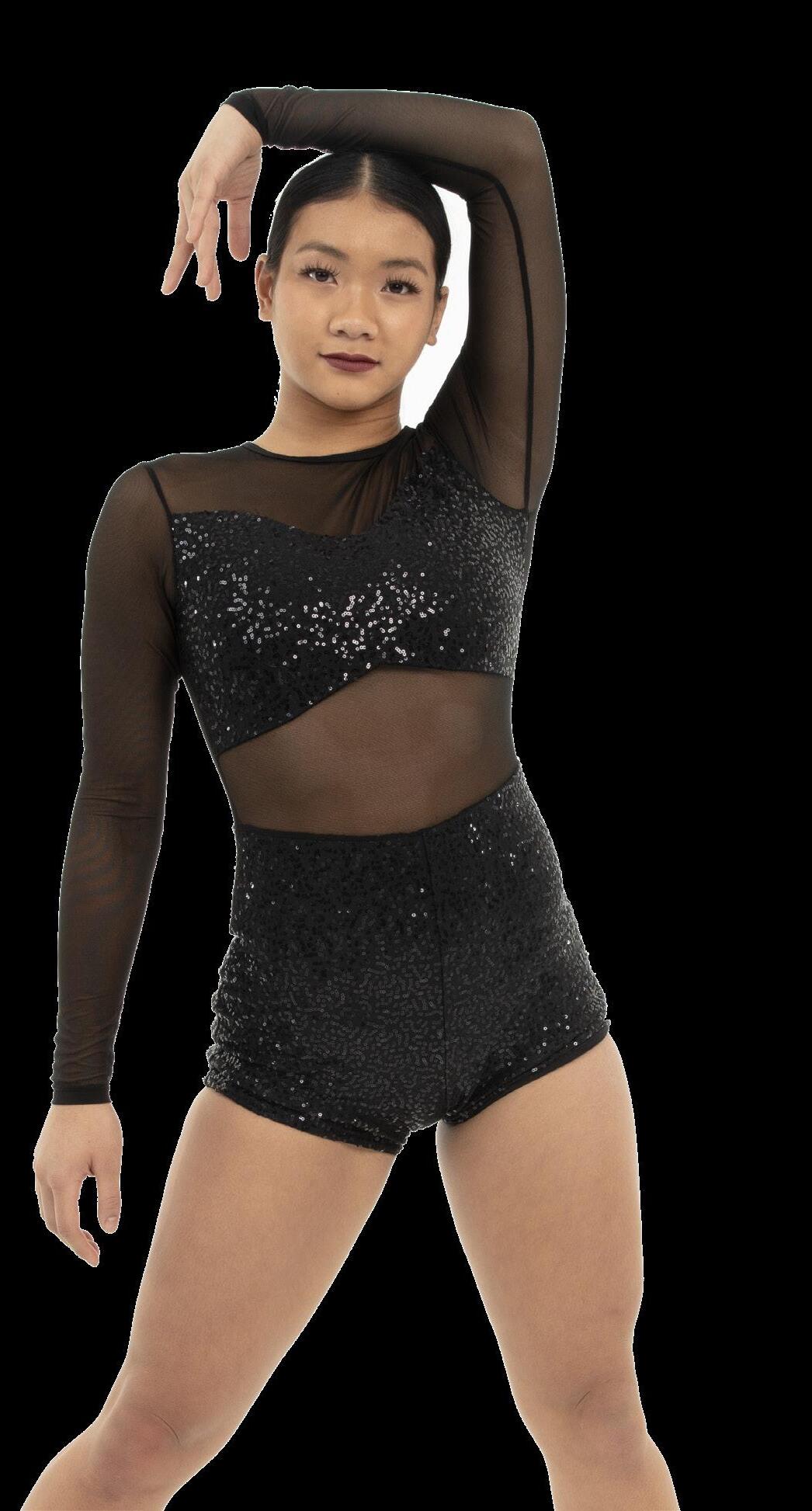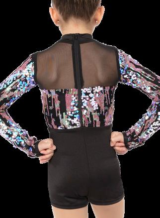 Alexandra. Biketard with illusion mesh neckline with straps, sequin bodice, raglan short sleeves, and keyhole back. The biketard is accented with a waistband, and side bustle for extra detail. Front lined bodice, with black tricot shorts. Center back G-hook closure. Nylon, Spandex.
