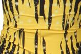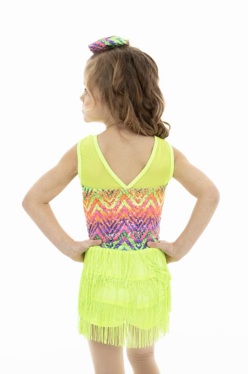 Alexandra. Rainbow sequin fringe biketard. Upper mesh panel bodice with a bright neon colored rainbow zig zag pattern sequin tricot bodice, and neon tricot shorts with tiered neon fringe. Featuring a lower v-neckline back. All in a neon electric yellow color. Pull on biketard. Nylon, Spandex. Fabric pattern placement will vary costume to costume.