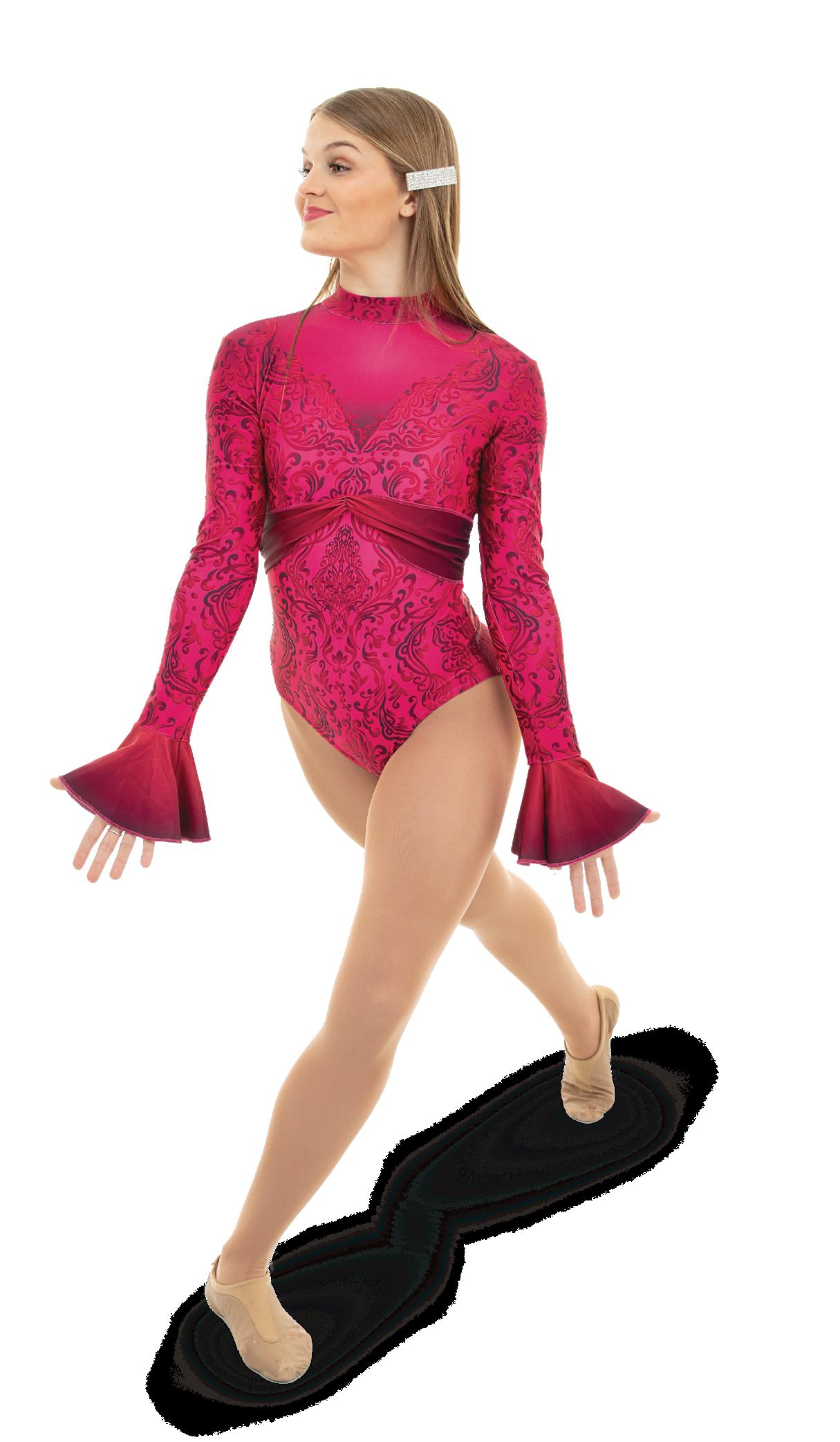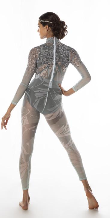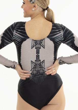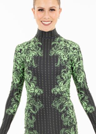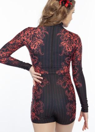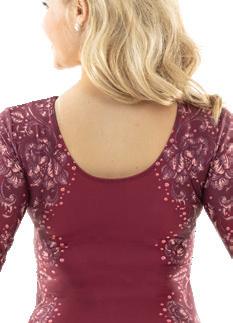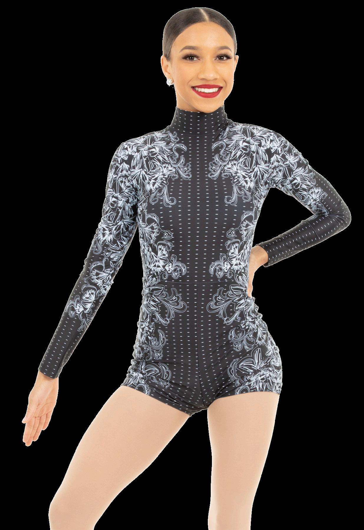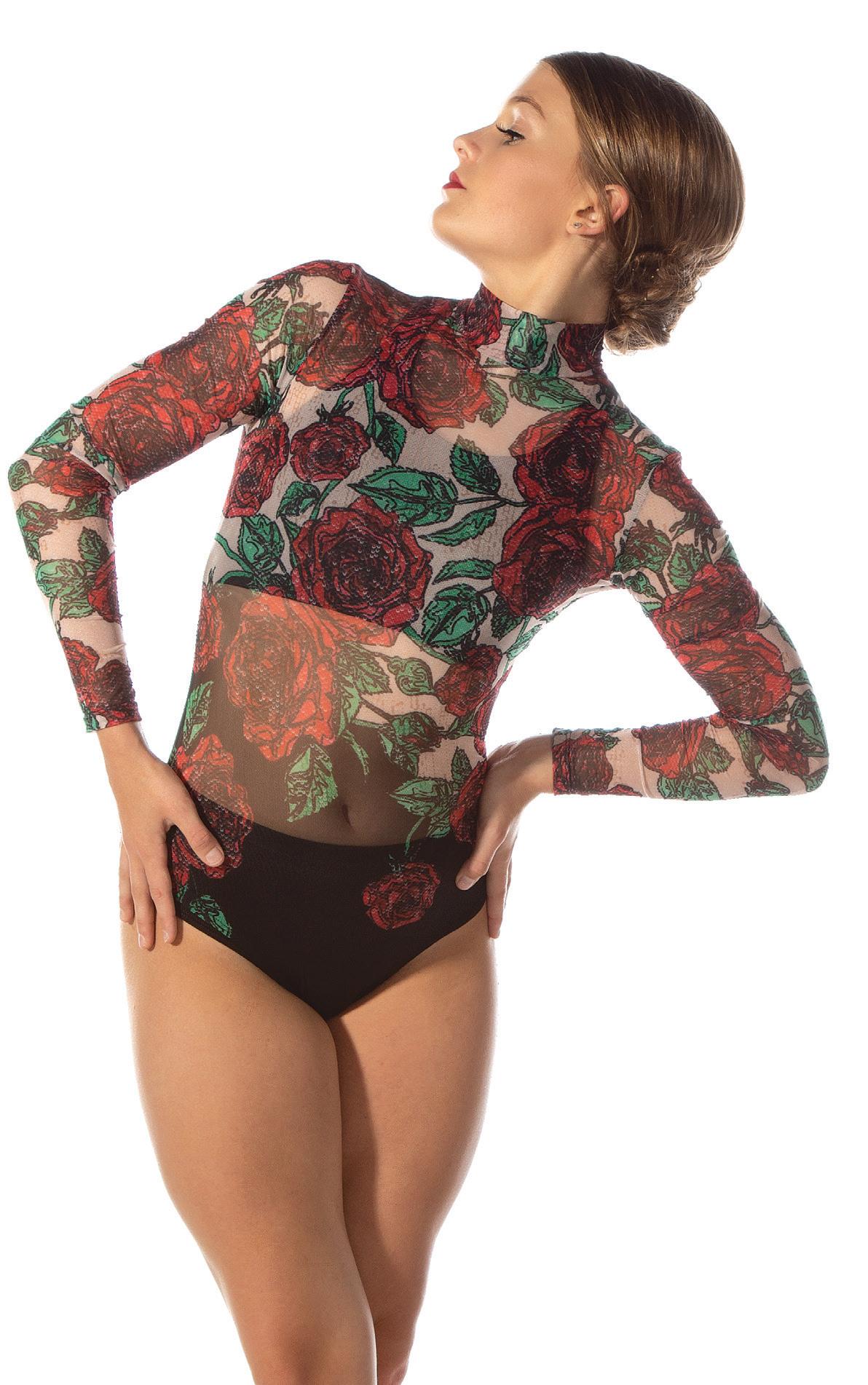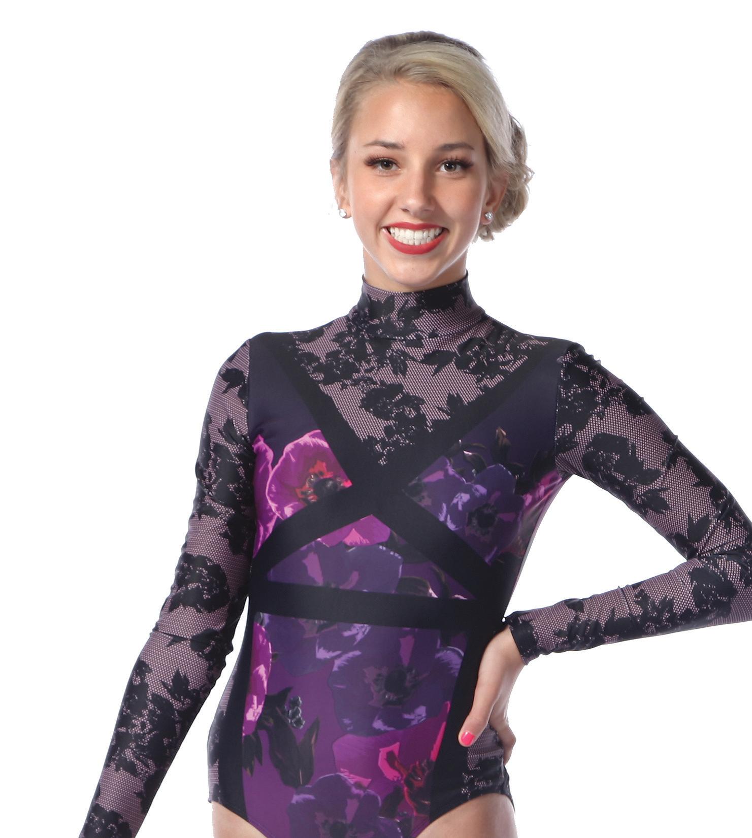Alexandra. This romantic long sleeve circle neck leotard has a dye-sublimated print that includes delicate lace, mesh, and rhinestone graphics. Fully lined. Polyester, Spandex.