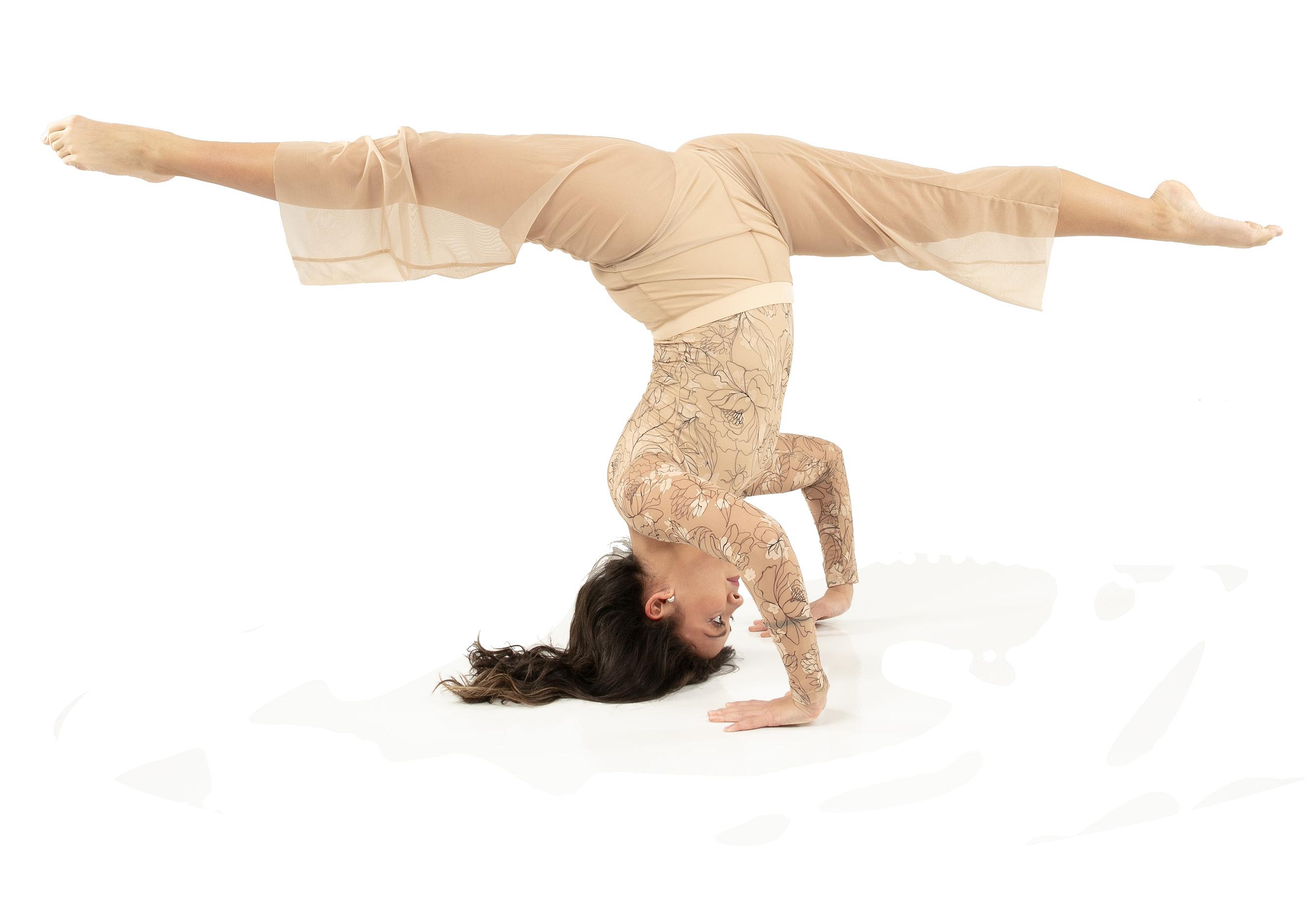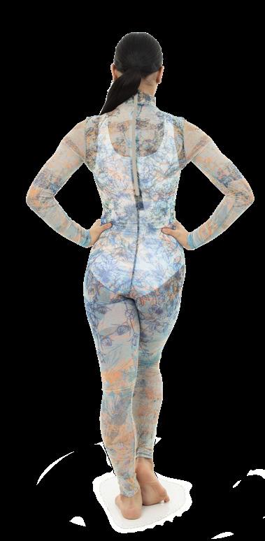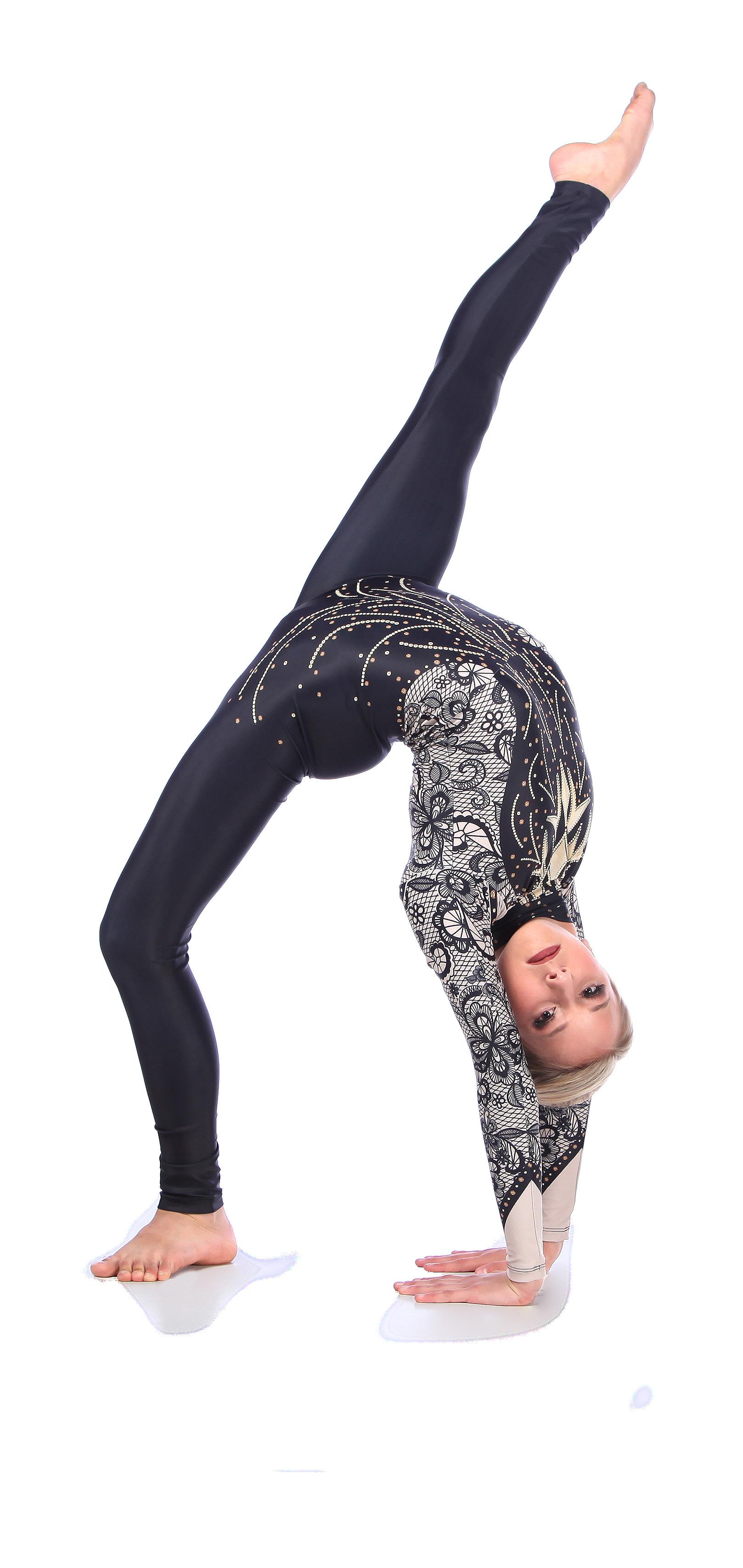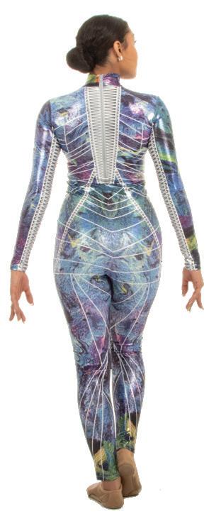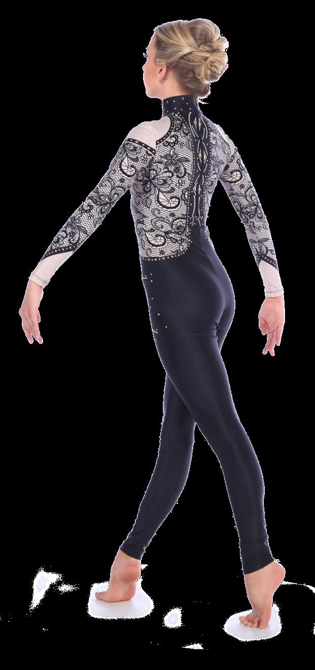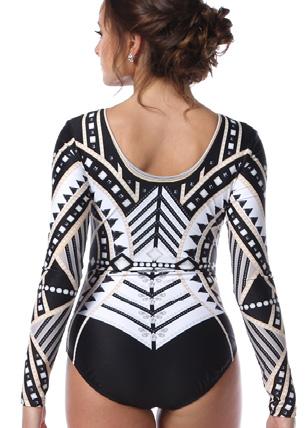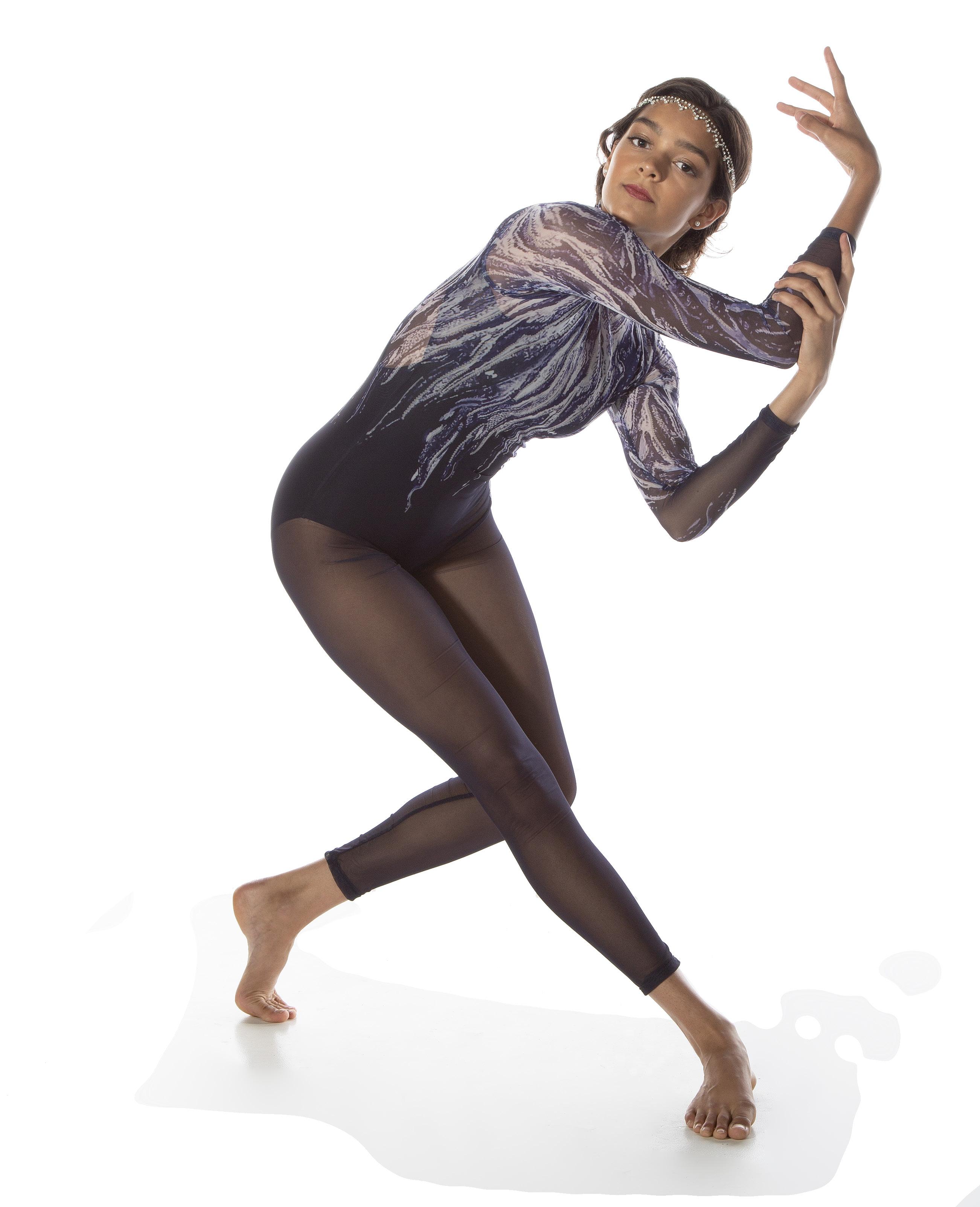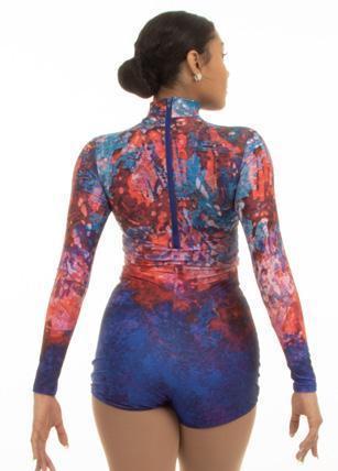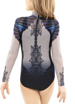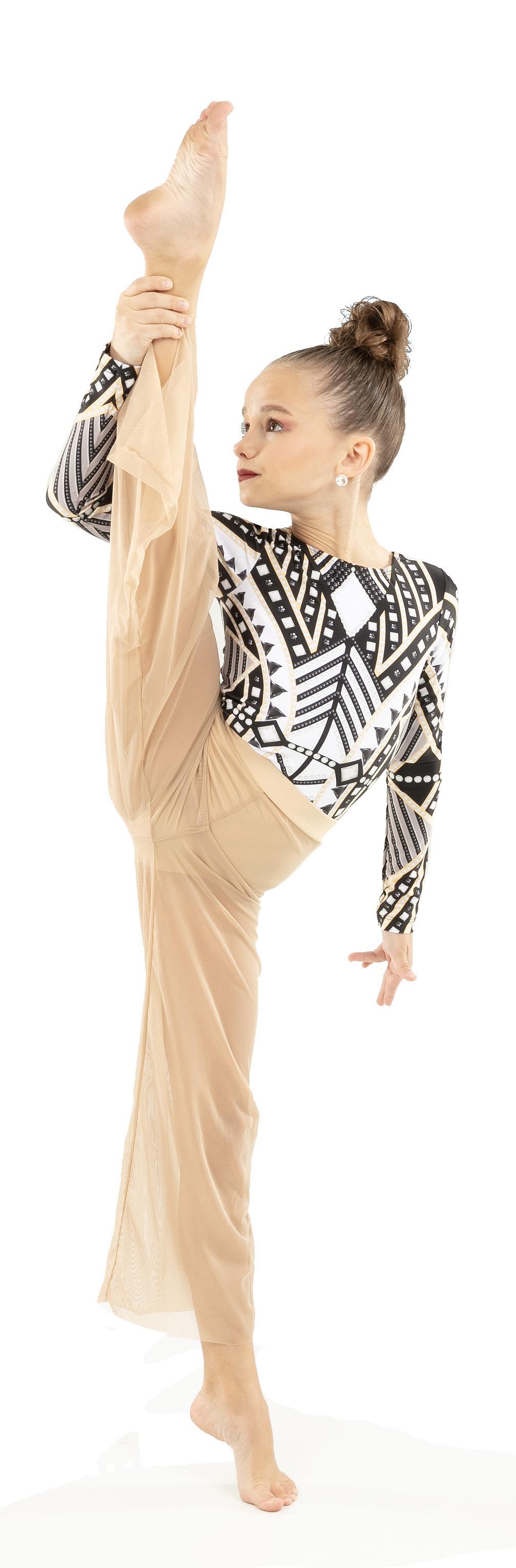 Alexandra. This romantic long sleeve circle neck leotard has a dye-sublimated print that includes delicate lace, mesh, and rhinestone graphics. Fully lined. Polyester, Spandex.